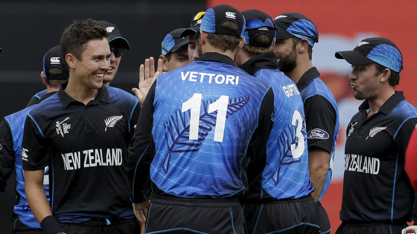 New Zealand's bowler Trent Boult (L) is congratulated by team mates after bowling out South Africa's Hashim Amla during their Cricket World Cup semi final in Auckland, March 24, 2015. Photo: Reuters