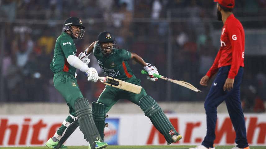 It was Mehedi Hasan Miraz who laid the platform with a four-fer but eventually it was the composure of Najmul Hossain Shanto who, alongside a feisty Taskin Ahmed, had burst into euphoria once they took the Tigers to the shores of a memorable four-wicket victory at the Sher-e-Bangla National Cricket Stadium in Mirpur on Sunday as Shakib Al Hasan and troops again outclassed reigning world champions England to take an unassailable 2-0 lead in the three-match T20I series. Photo: Reuters