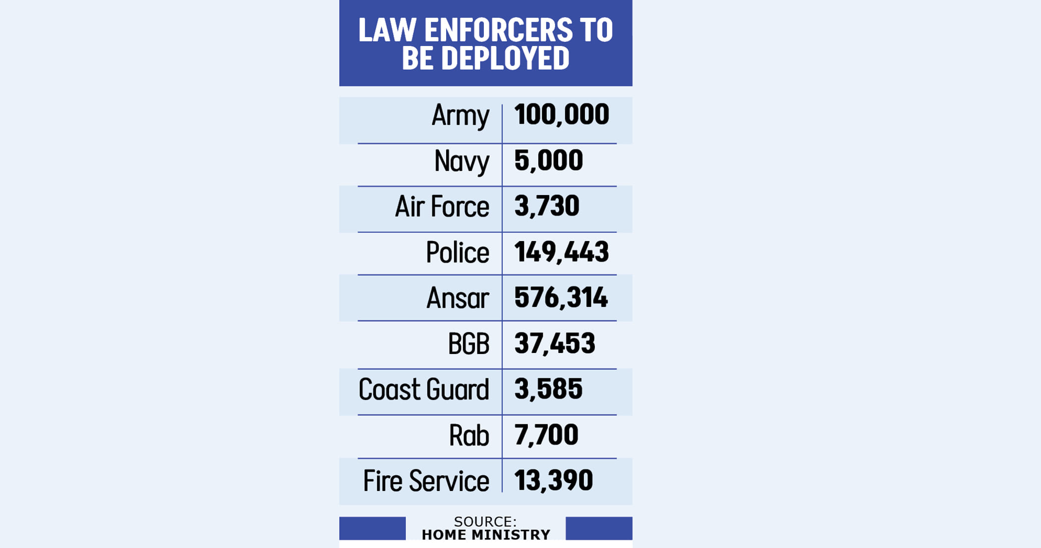 Drones will also be deployed, with a total of 418 drones to be used by different agencies: 200 by the army, 16 by the navy, 100 by the Border Guard Bangladesh, 50 by the Bangladesh Police, 20 by the Coast Guard, 16 by Rab and 16 by the Bangladesh Ansar and Village Defence Force.