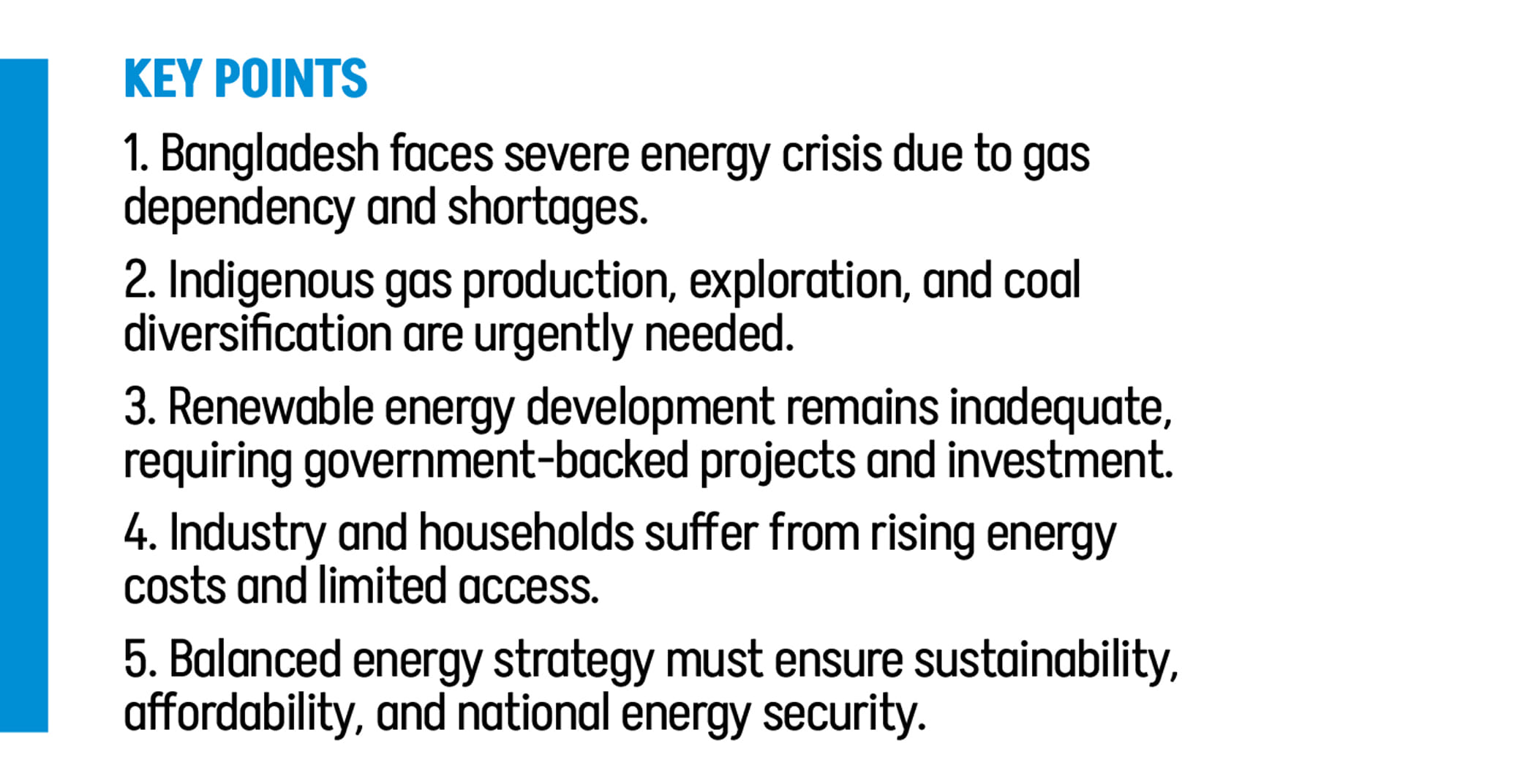 No development strategy can succeed without resolving this primary energy crisis. Shortages will intensify after LDC graduation, compounding industrial, financial, and trade challenges. Decades of neglect cannot be reversed overnight: import infrastructure, exploration, fuel switching, and renewable deployment all require time. In the short term, LPG and oil remain the only viable stopgap solutions. The critical task for policymakers is to manage a transition from entrenched usage patterns to more market-based alternatives.