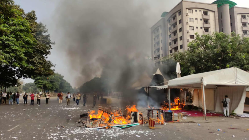Earlier this morning, the protesters gathered in front of the stage set up at the South Plaza of Jatiya Sangsad Bhaban ahead of the July National Charter signing ceremony.