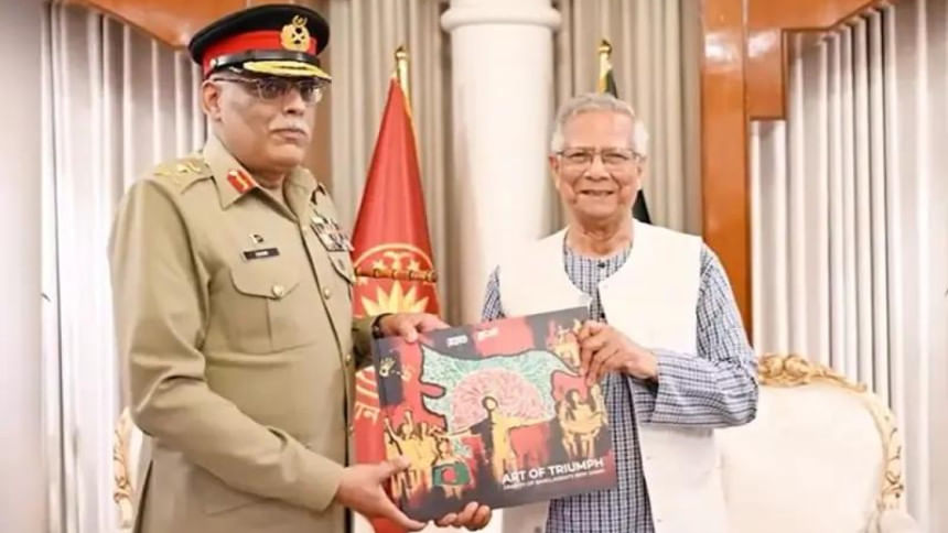Clarifying what was actually presented, CA's press wing said, "In fact, Chief Adviser Professor Dr Muhammad Yunus presented to the Pakistani General The Art of Triumph, a collection of colourful and diverse graffiti drawings painted by students on various walls throughout the country, including the capital Dhaka, during the July mass uprising."