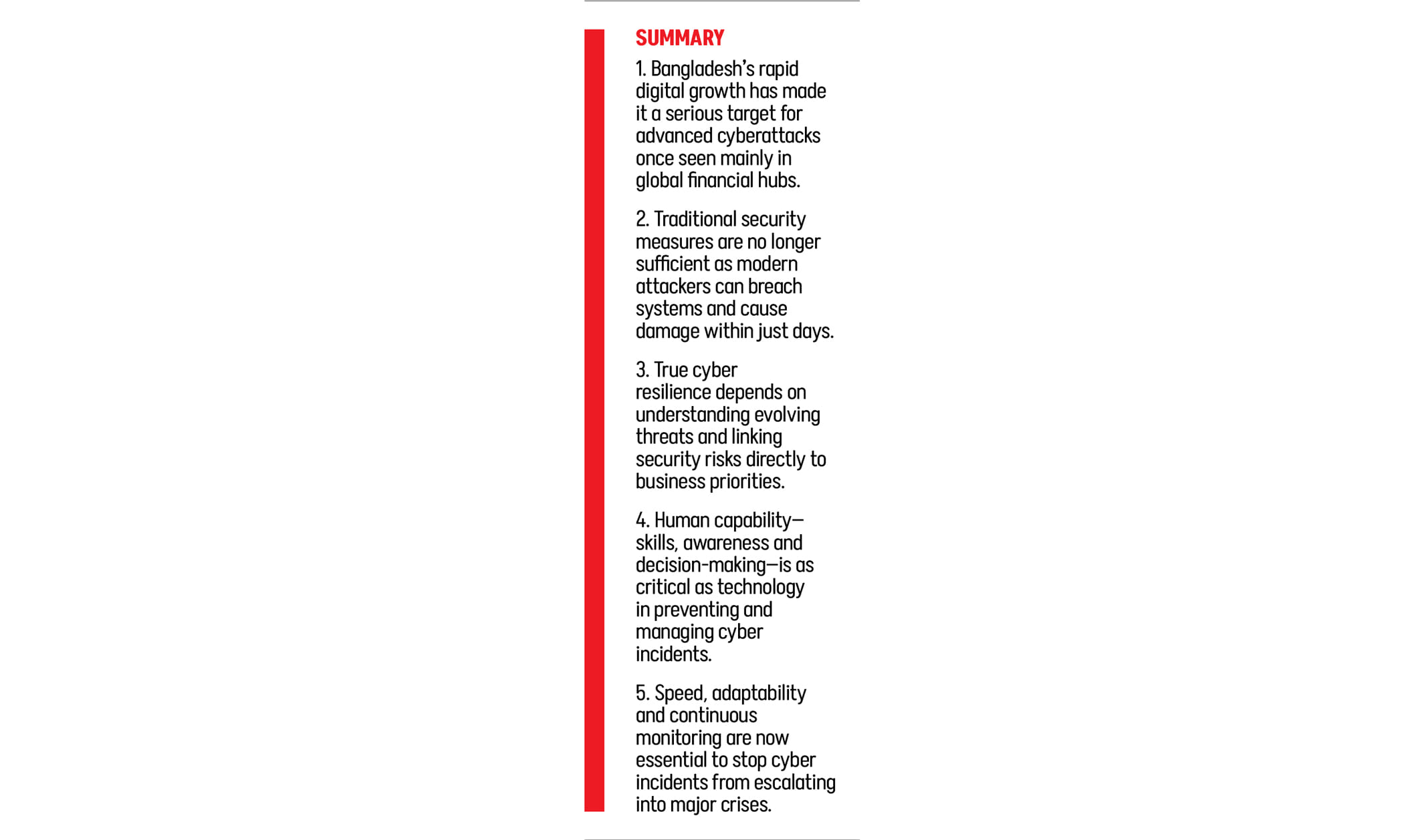 For Bangladeshi organisations still viewing cybersecurity as an IT department concern rather than a business priority, this timeline should be a wake-up call. Building true cyber resilience matters. The ability not only to prevent attacks, but also to adapt, respond and recover, requires focusing on five connected principles.