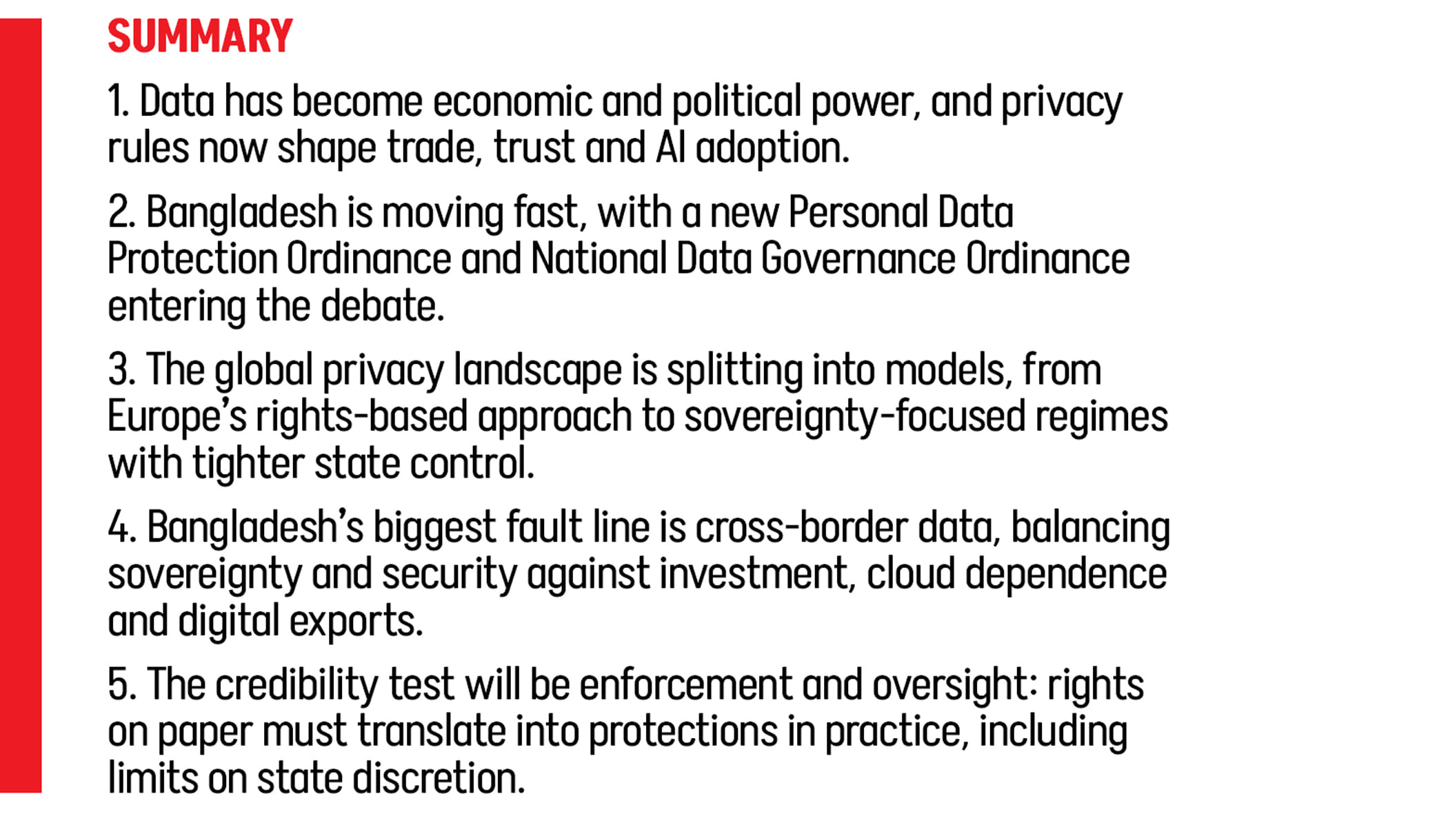 Bangladesh is stepping into this debate at a moment of unusual intensity. In late 2025, the country moved towards its first comprehensive privacy framework with a Personal Data Protection Ordinance and a National Data Governance Ordinance, both gazetted in November. And in early January 2026, the government approved amendments that, largely removed broad data localisation requirements for technology companies and dropped jail terms for violations by tech firms.