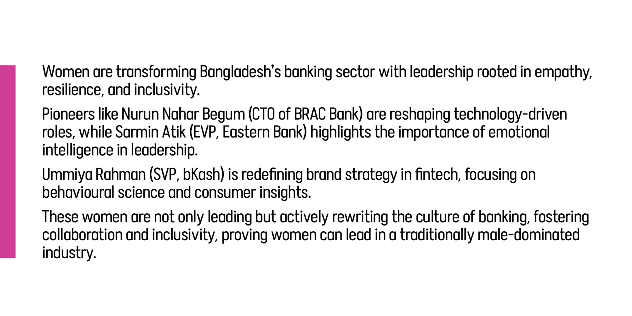 There is no denying that Bangladesh’s banking sector is now more technologically ambitious and aligned with global thinking than ever before. Here, women are creating environments where collaboration replaces competition, and these three progressives are shining examples.