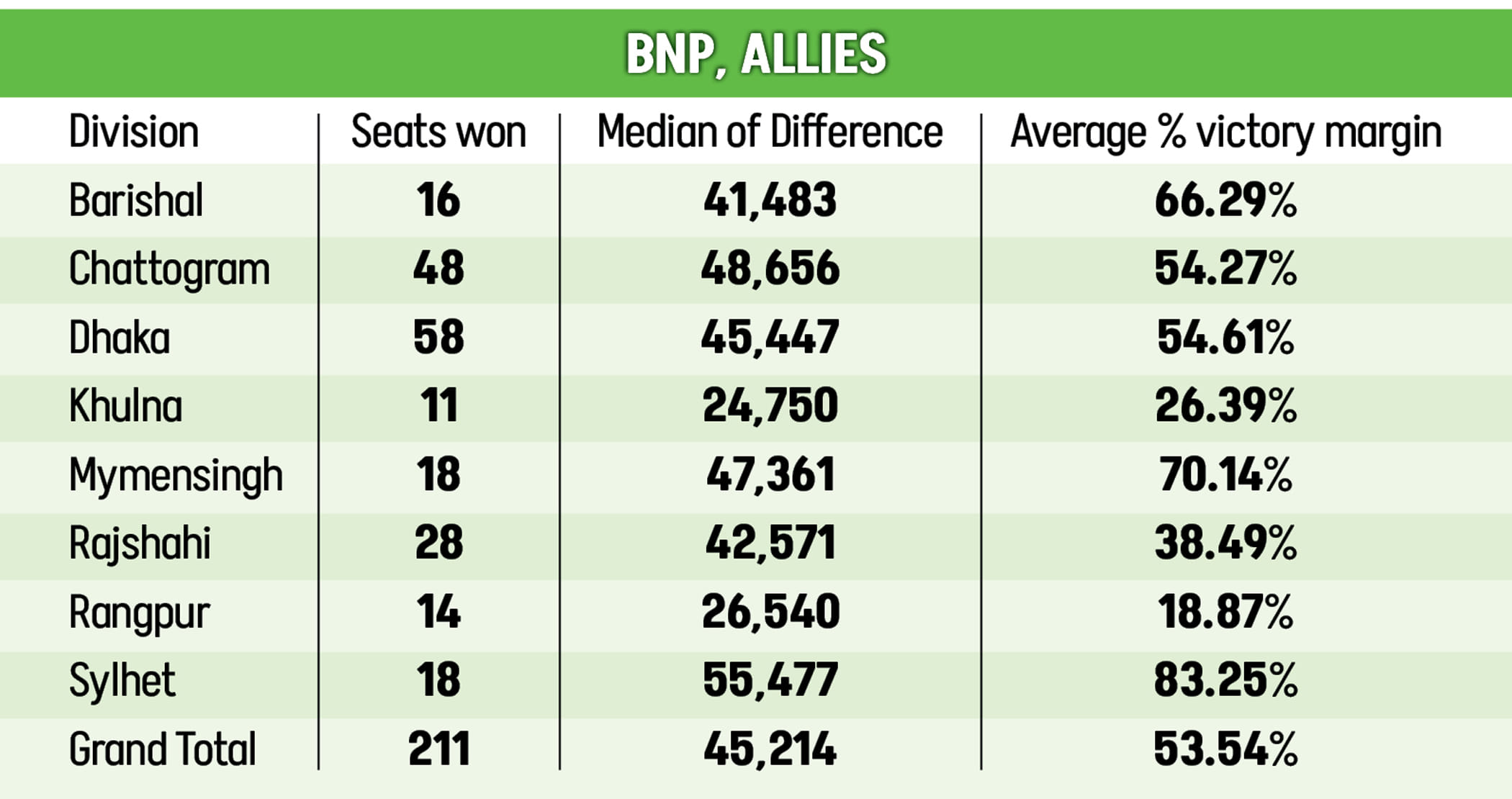 The BNP-led alliance swept to power with a commanding landslide, recording a median winning margin of 45,214 votes across the 212 seats it secured.