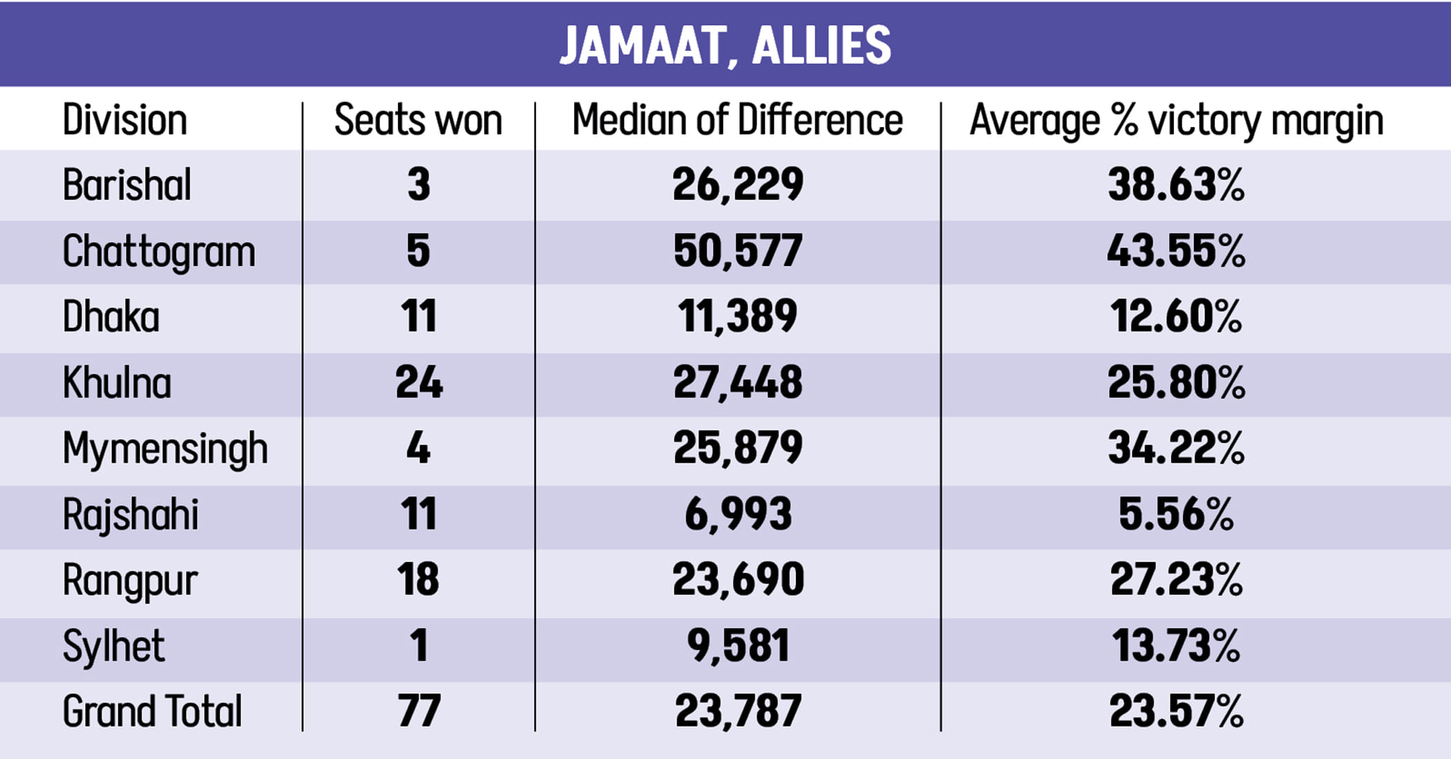 Jamaat’s most comfortable victories came in the Chattogram division. Although it won only five seats in the region, the alliance posted an average margin of 43.55 percent -- its highest regional performance.