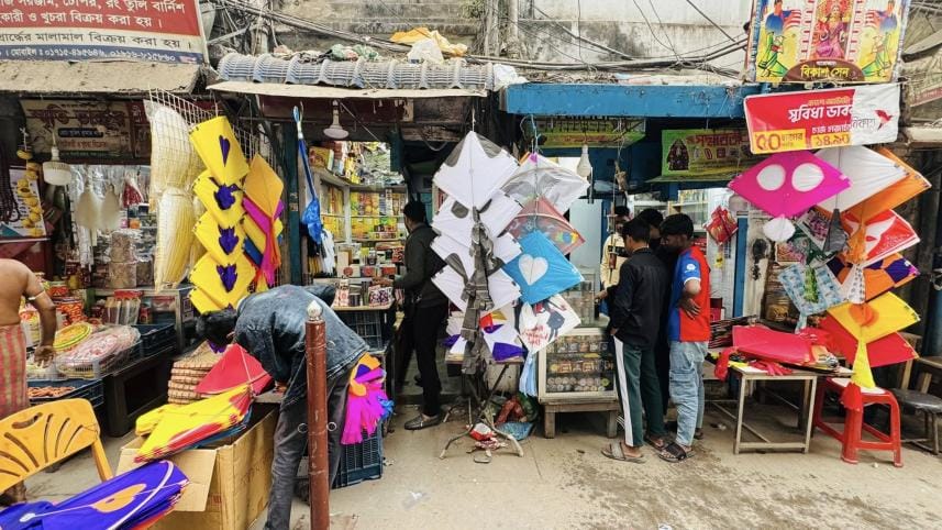 Shankhari Bazar remains a major hub, selling designs such as Chashmadar, Kautadar, Pankhiraj, Prajapati, Eagle, Bat, Love kites, Tekka and Maladar, along with several foreign-patterned varieties. Prices range from Tk5 to Tk25 for ordinary kites, while special designs sell for between Tk100 and Tk300.