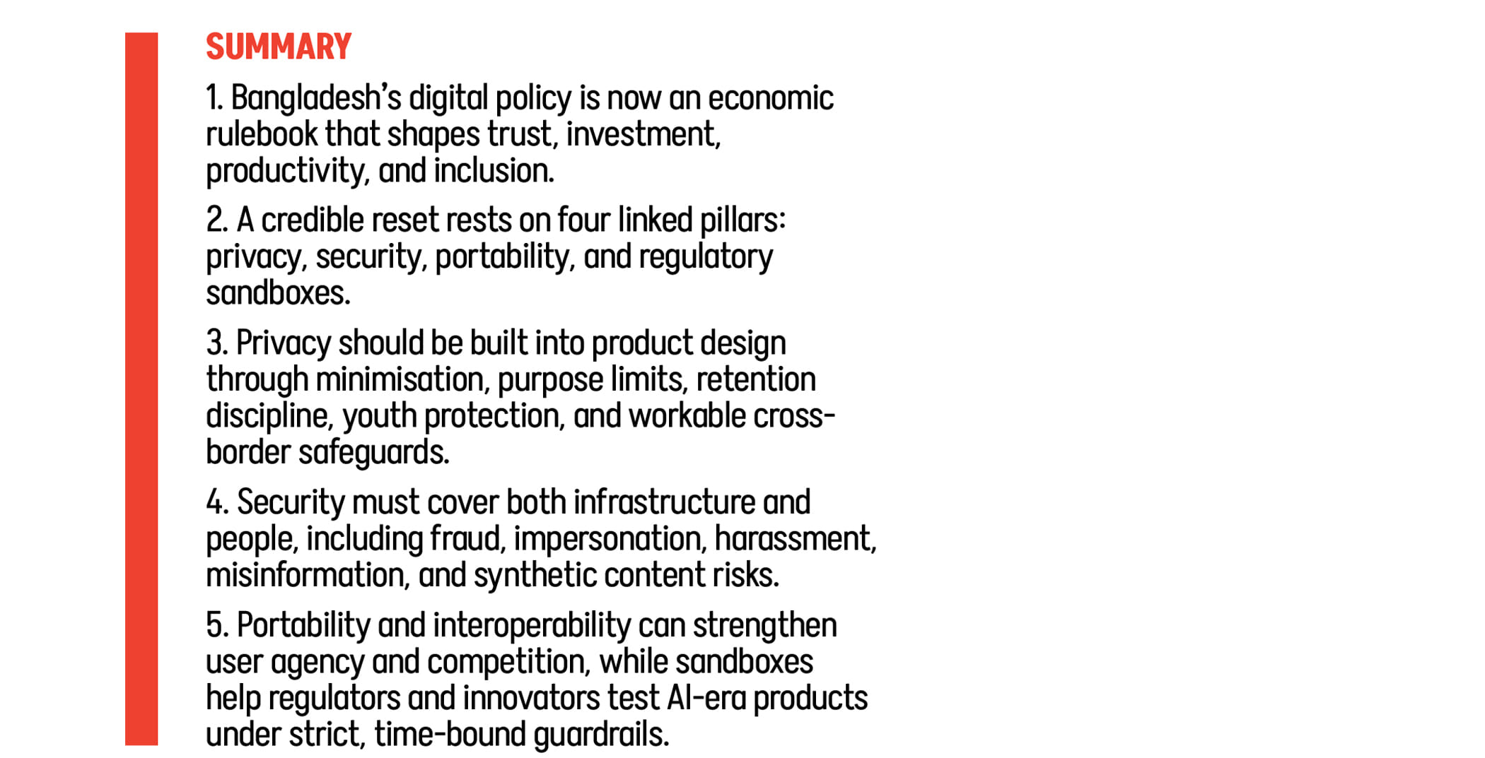 A constructive policy reset can be organised around four pillars that are now standard in mature digital ecosystems: privacy, security, portability, and regulatory sandboxes. These pillars are interdependent. Privacy shapes legitimacy. Security protects people and systems. Portability strengthens user agency and competition. Sandboxes create a structured way to learn and adapt as technology evolves. Together, they support innovation without sacrificing accountability.