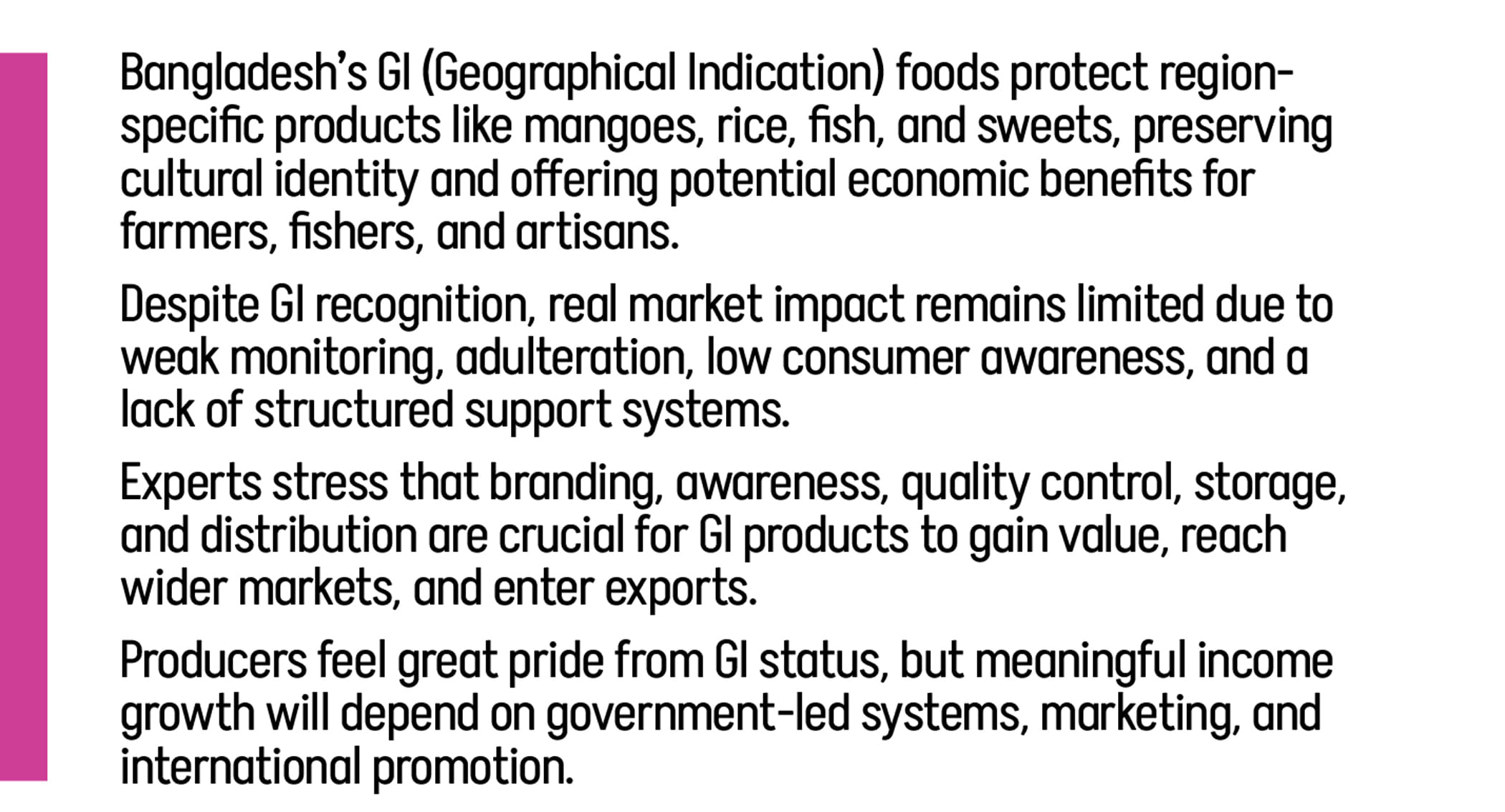 Stories of experts envisioning systems and producers holding on to tradition paint a clear picture of what GI foods could become for Bangladesh. The potential is enormous. A GI label creates exclusivity, and exclusivity can elevate price, demand, and export opportunities.