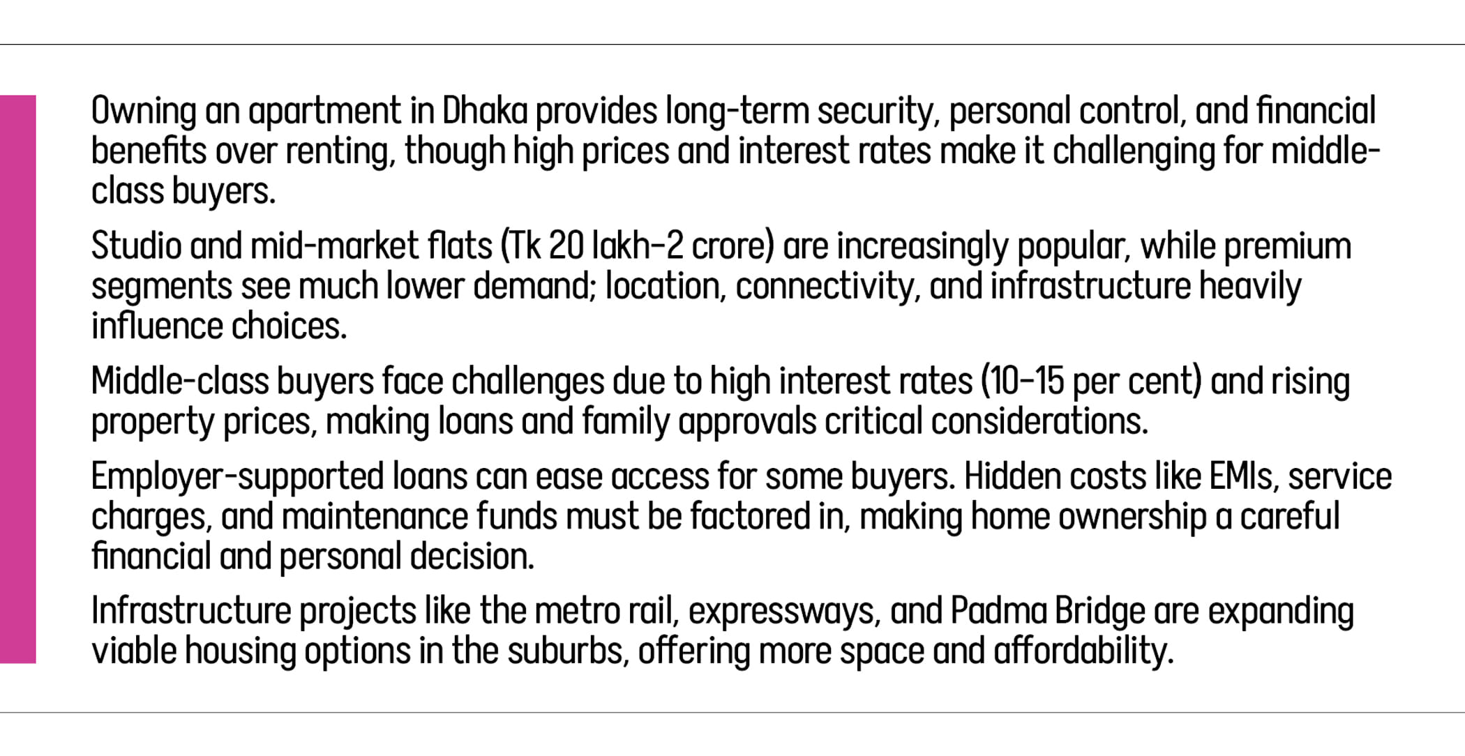 New roads and bridges are opening up southern and northern routes. This is pulling potential owners out of crowded central Dhaka toward cheaper areas that have more open space. The Padma Bridge, for example, caused a housing boom along the Dhaka–Mawa–Bhanga expressway.