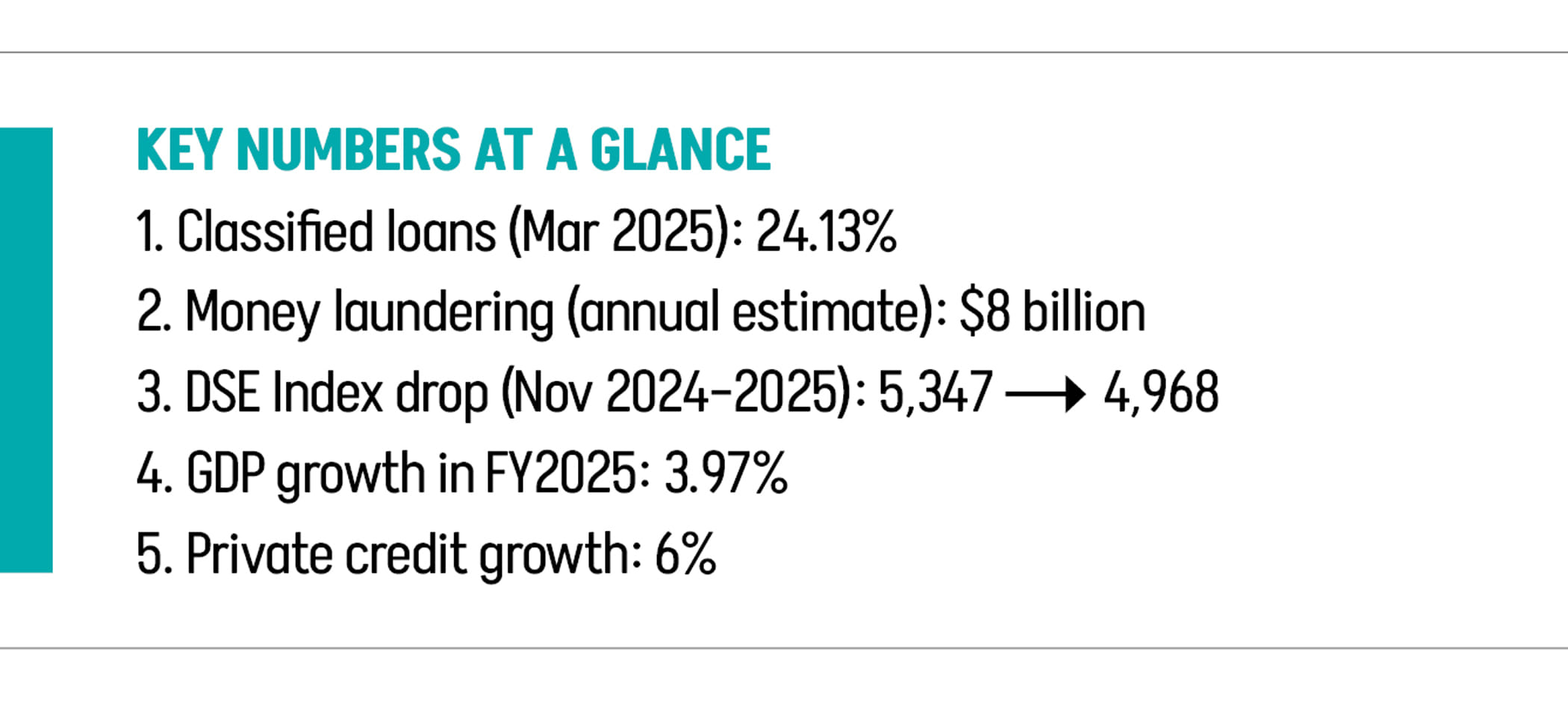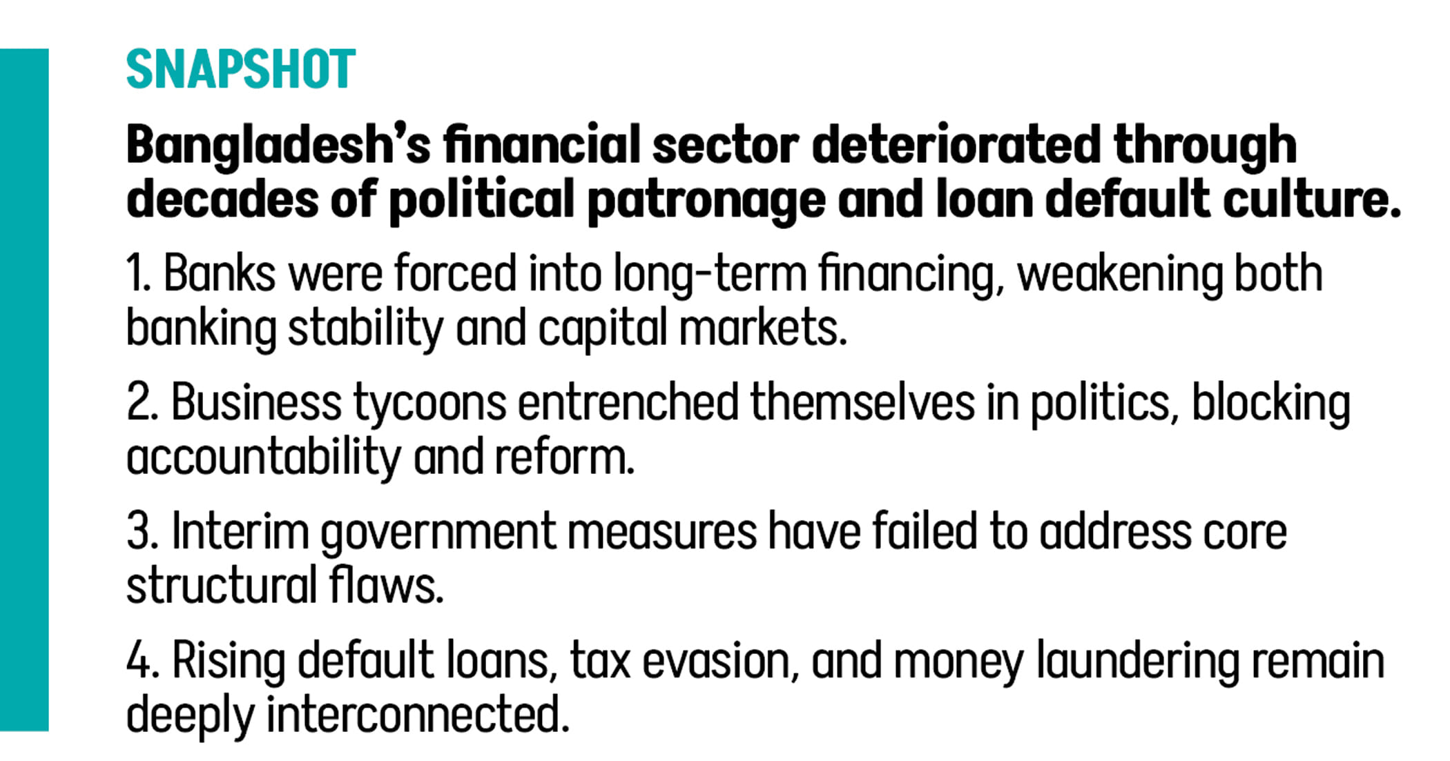 Default loans kept rising without any sign of abating. The amount of classified loans occupied 16.93 percent of total outstanding loans in September 2024, rising to 24.13 percent in March 2025. Recently, the central bank has resorted to using the sugar-coated definition of default loans, which will simply put the dirt under the carpet temporarily without delivering any viable solution. Global Financial Integrity estimates the annual figure of money laundering as around 8 billion dollars, with no evidence that this figure has gone down since the interim government took office.