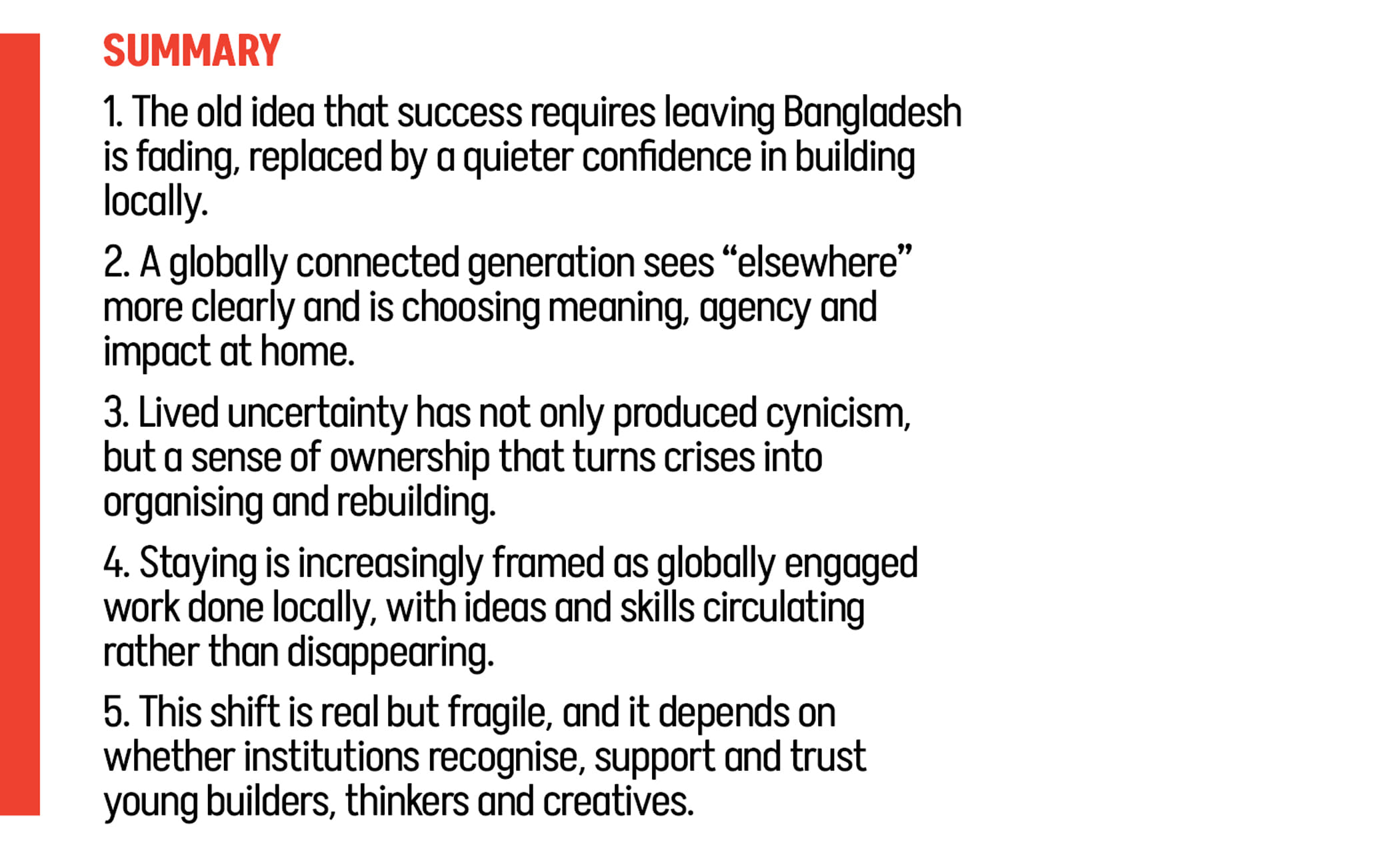 What has emerged is a form of homegrown confidence. Young people are starting companies because they see gaps no one else is addressing. They are choosing careers that allow them to contribute locally while remaining globally relevant. They are redefining success as impact, continuity, and ownership, rather than distance. This confidence is not loud, but it shows up in choices: in the decision to return after studying abroad; in the choice to turn down a safer job for a riskier idea; in the insistence that staying does not mean settling. These choices are reshaping how Bangladesh appears, not just to the world, but to itself.