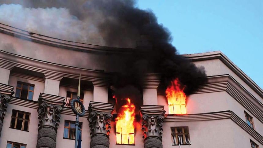 Just after sunrise, thick smoke could be seen rising into the clear blue sky from the burning top floor of the main government building, located in the historic Pecherskyi district of Kyiv, Reuters witnesses said.
