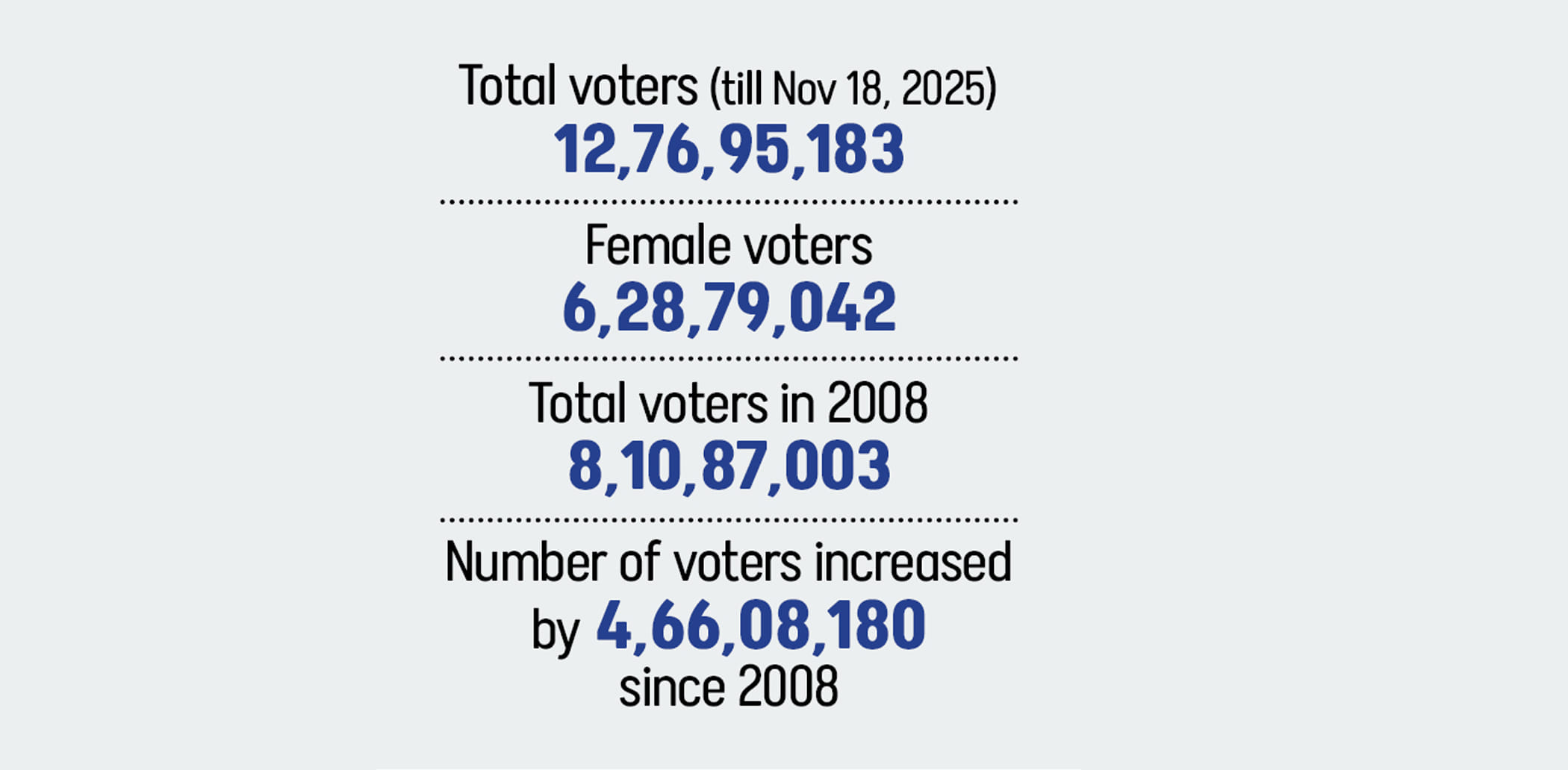 The numbers tell a story of scale. In the 2008 election, Bangladesh had 8,10,87,003 registered voters. By November 18, 2025, that figure had grown to 12,76,95,183, including 6,28,79,042 women -- an increase of 4,66,08,180 voters over 17 years.
