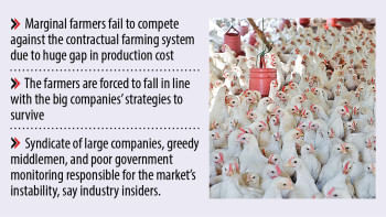 It has been reported that the big players – around 12 of them – dominate the industry and manipulate the prices of chicks and poultry feed to rake in higher profits. Let's consider the prices of poultry feed, for instance. Firms that are engaged in contract farming with the big players, get to purchase 50kg sacks of poultry feed for Tk 2,500. The same is sold to marginalised/independent small poultry farmers at Tk 3,300. This is to coerce the independent, marginalised farmers into entering contract farming agreements with the large farms.