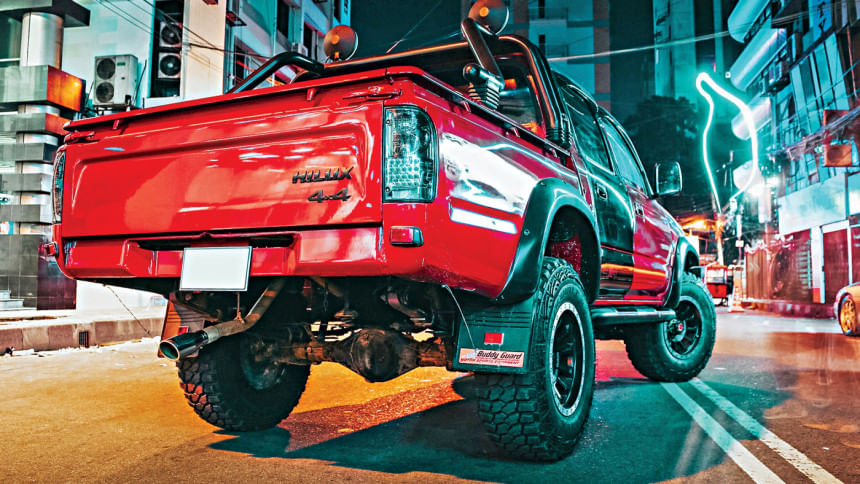 The red TRD pro-esque 2005 Hilux came to be an adventitious decision by Fahmid Ishtiaque Ahmed, as he wanted to fish for something unique in a sea of numerous Defender and Patrol builds. With the help of a contact in the embassy auctions, a 2.7L 3RZ Hilux with a fairly low mileage was sourced and Samiur Rahman Tushar, a young veteran in the deshi petrolhead community, drove the noble Hilux straight to his restoration facility, Machinam. A considerable amount of hours wrenching and some TLC and an overnight parts from Japan scene later, the transformation took shape into what you're seeing in the pictures. The cabin was transformed into a 4 seater configuration, made out of Axio seats in the front and front seats from a Mark II in the rear. The dashboard was given the leather treatment, along with a Momo steering wheel. Doors and windows were given automation from a Hilux Surf. The mean demeanor of its front fascia is alleviated by an ARB inspired custom made front bumper, in conjunction to TRD headlamps and a custom grille. The bed houses an ARB design rollbar. The meatier Zestino mud terrain tyres and the 16" 4x4 style wheels were sourced by Platinum Wheels. The cherry on top(literally) yellow fog Lamps and an LED bar mounted on the ARB design bumper and roll bar. "It drives well and is quite quick although the skittish rear due to an empty bed is typical of pickup trucks," Tushar said and added, "Best place to be is in the rear seats, big, bolstered and recline able."