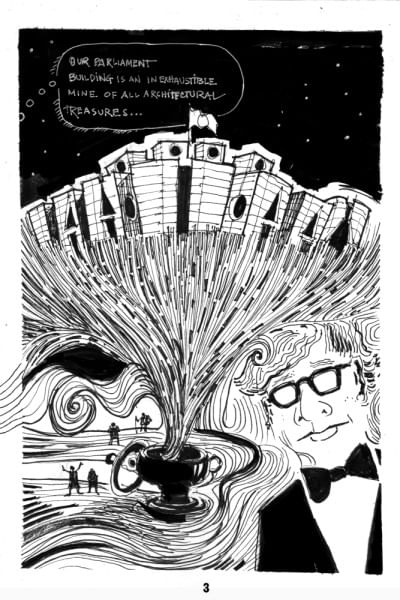 Plate 04 shines a moonlit light on Muzharul Islam himself, the pioneer of Bengali modernism. His works bridged the vernacular with the global, creating a language that was both rooted and forward-looking. The thought bubble in the sketch—"Architect and pioneer of Bengali modernism has greatly enriched our architectural treasure"—captures his role as a translator of memory into modernity.