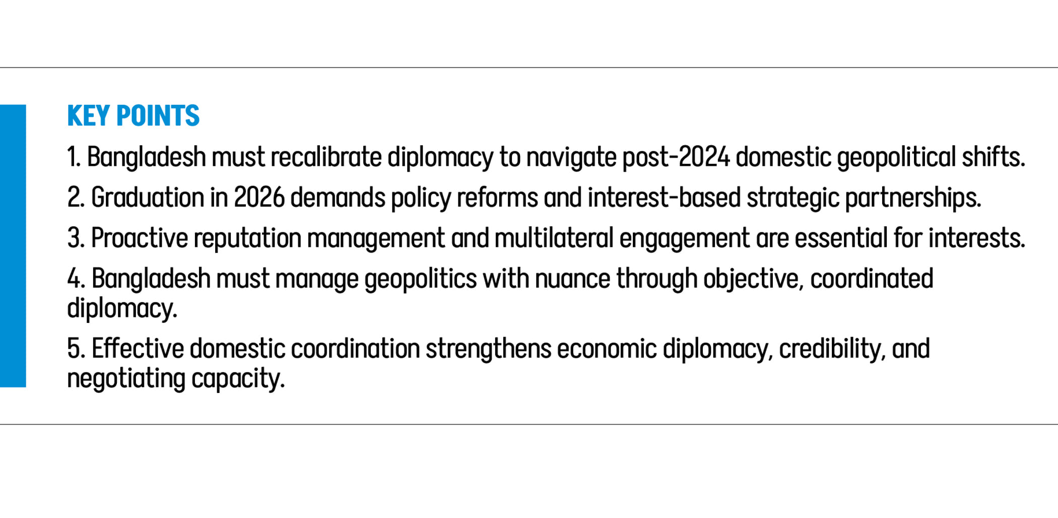 In the post-July 2024 situation, Bangladesh has been facing several new strategic realities. At the domestic level, a generational shift has been redefining the political landscape and articulating the urge for justice as well as an equitable economic order. The graduation of Bangladesh in 2026 will again frame and reset our external relations with practically all partners. Such a reset will obviously demand corresponding reforms in many areas of our domestic policy and practices. Old mindsets and behaviours may have little relevance in the evolving actualities.