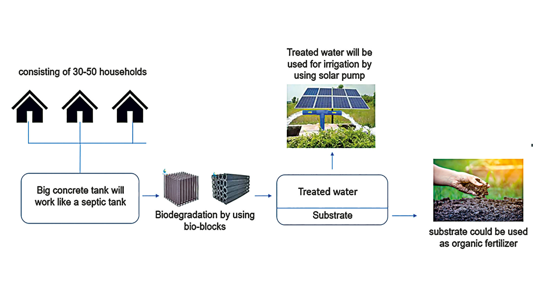 First, we must isolate the sewage from the surrounding soil, which could be done by using a plastic tank instead of rings. The plastic tank should be half-buried under the ground, and the commode/pan should be placed over that tank. This individual plastic tank should be connected to a bigger concrete retention tank (should be in a common place consisting of 30-50 households in the rural community) by pipeline to carry the sewage into that bigger concrete tank, as shown in Figure 1. This bigger tank will work like a septic tank. The overflow from the concrete tank should then be taken for biodegradation by using bio-blocks and solar pumps. Treated water from the bio-degradation tank will be safe for disposal or for use in irrigation. The substrate from the biodegradation tank could be used as organic fertiliser after dehydration. The technology for sewage treatment is easy, and the equipment is available in the local market. This biodegradation system could also be used in the urban and suburban areas where there are no sewerage systems, and people are using only septic tanks. This initiative could be implemented as a small community-based project consisting of 30-50 or a maximum of 100 households where the community members will take the responsibility to operate and maintain the system on their own. The total system will be operated by solar electricity.