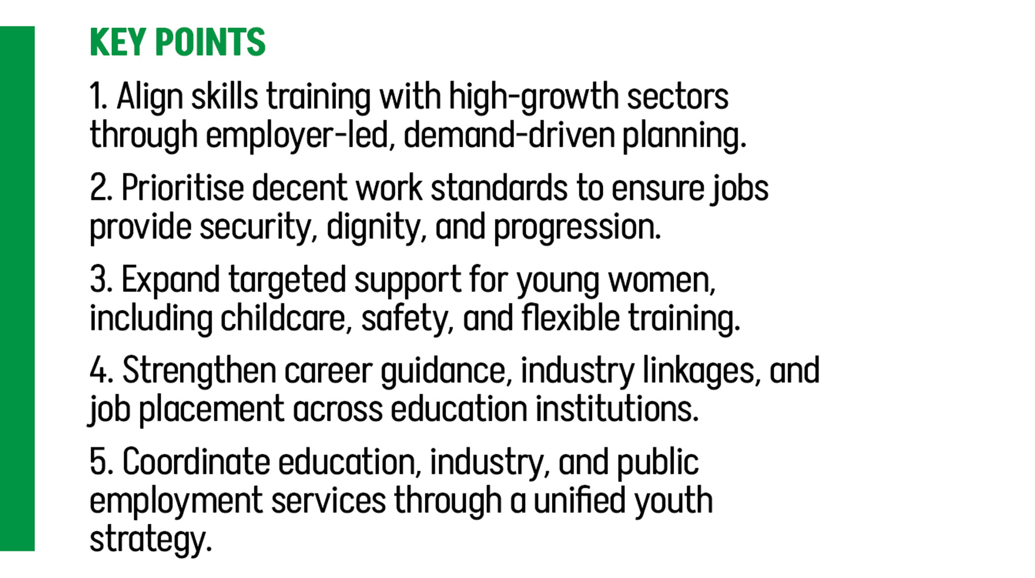 Many young people are still being trained for jobs with limited prospects. Aligning skills development with these emerging sectors is critical to ensuring training leads to meaningful employment. Recognition of prior learning, flexible training pathways, and stronger employer partnerships can help youth move from learning to earning.