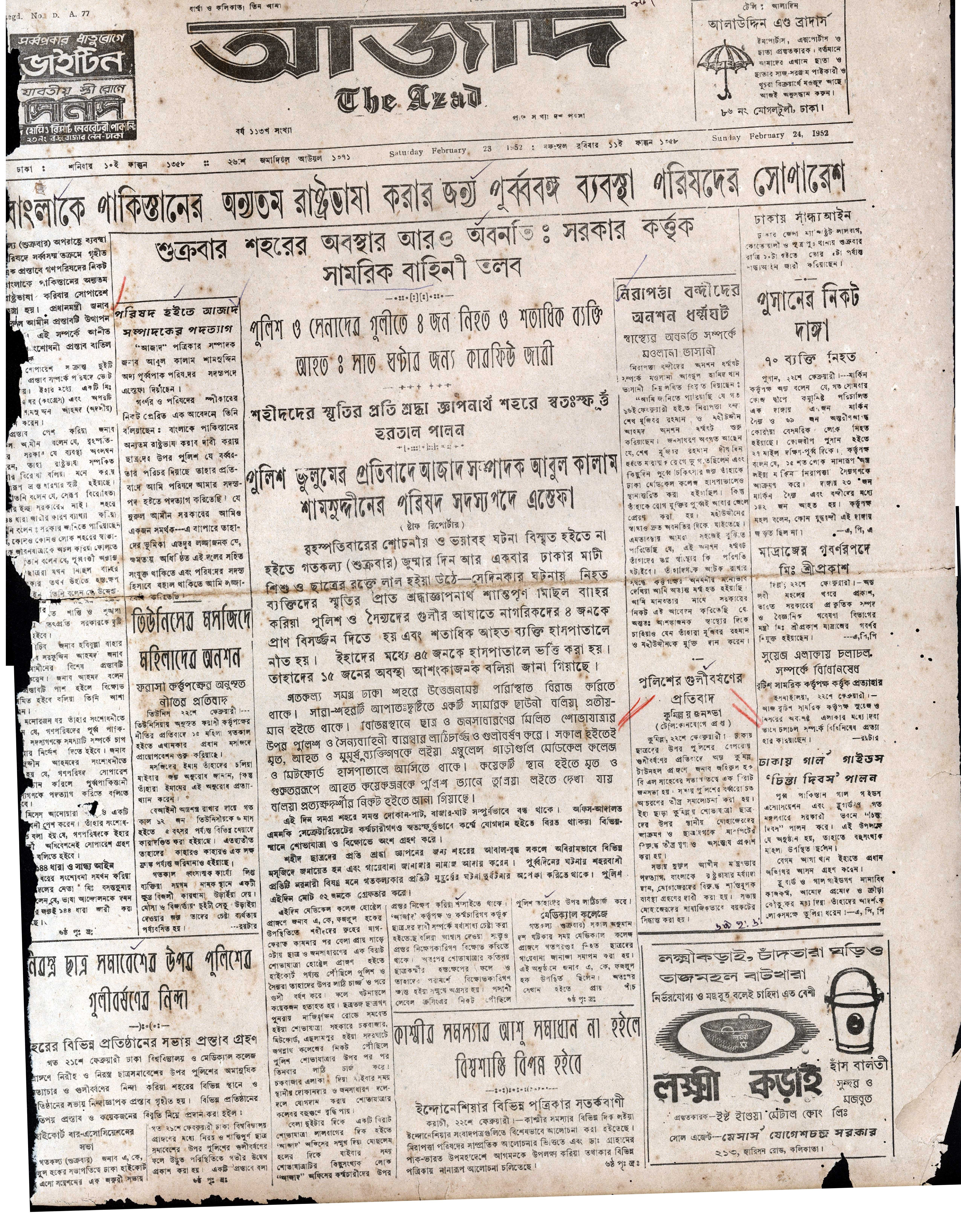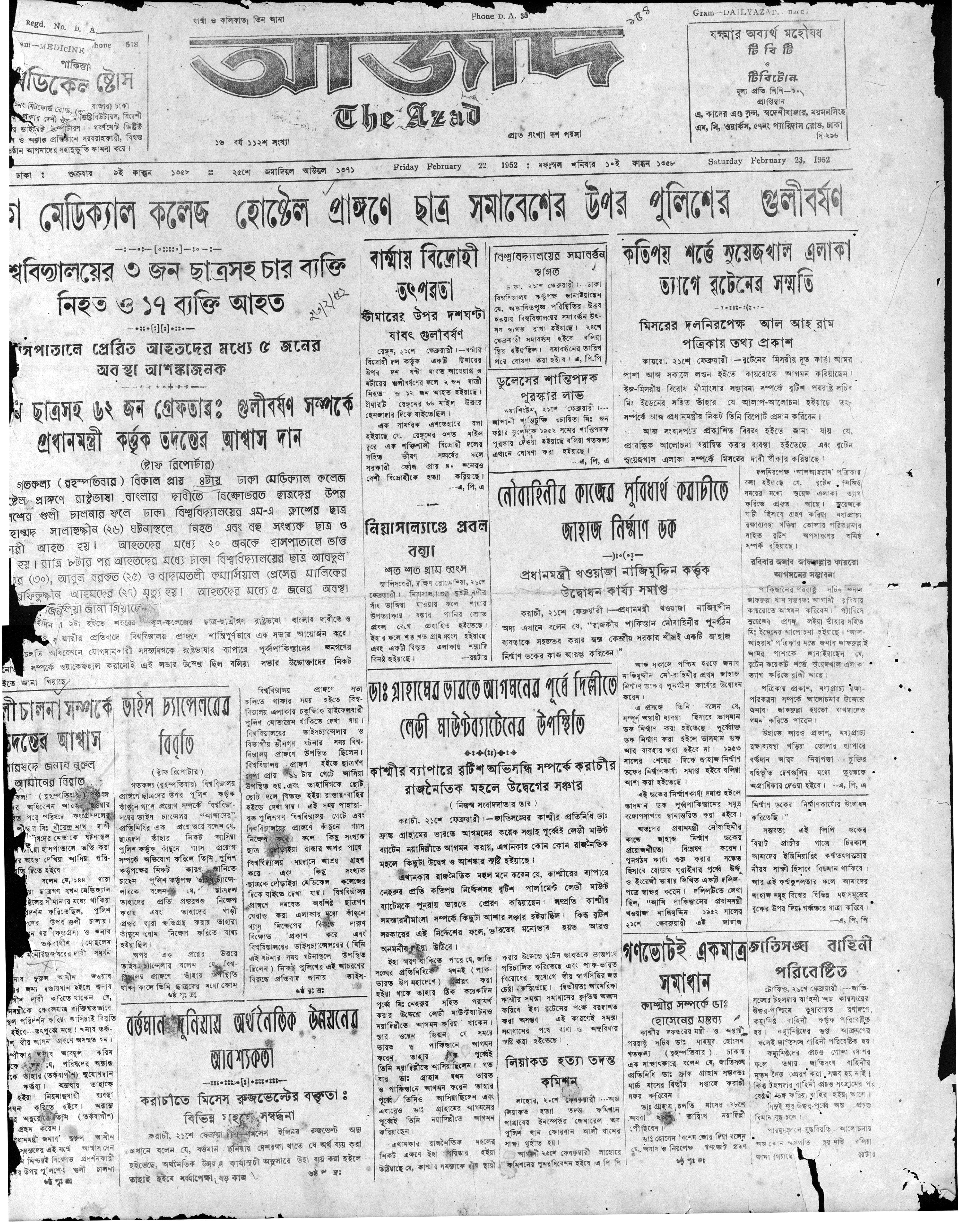 On February 22, The Azad published the news of the student shooting in an eight-column banner headline. The main headline throughout the newspaper was - Police opened fire on student gathering on Dhaka Medical College premises. The sub-head was - Four people including 3 university students killed and 17 people injured.