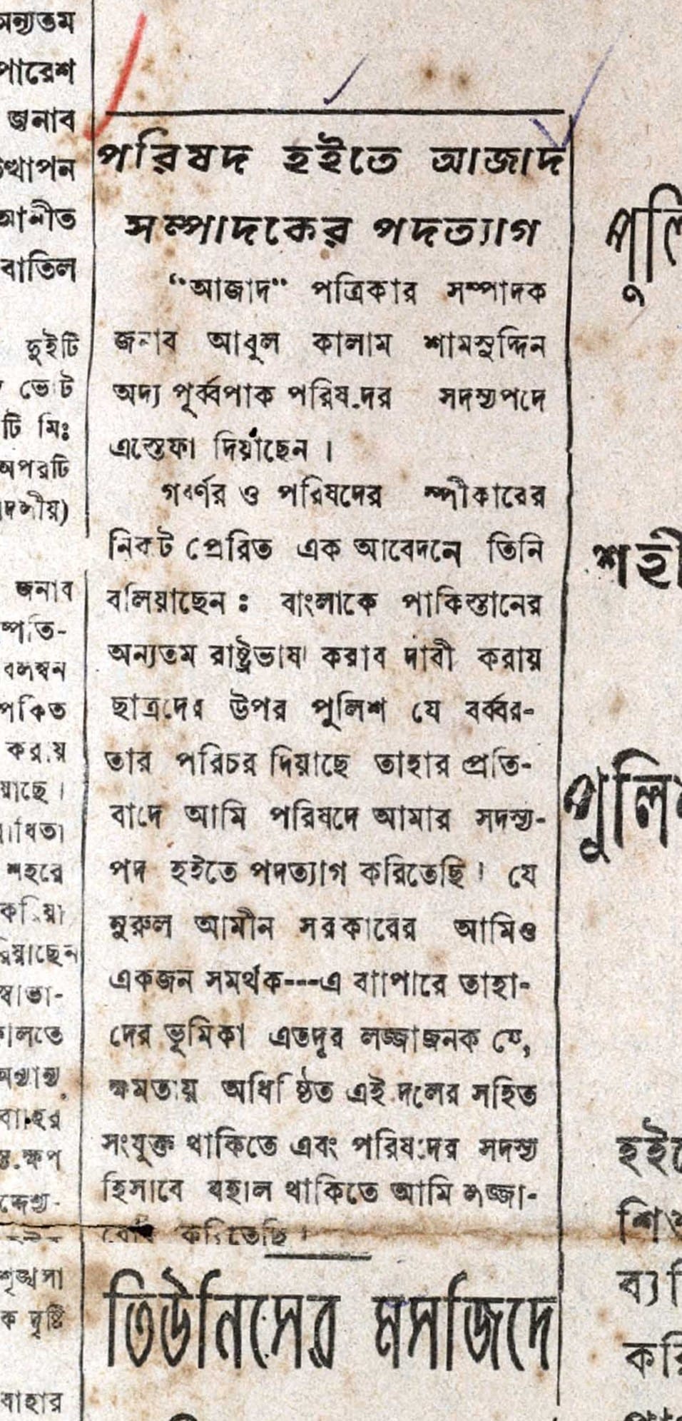 It has been mentioned earlier that The Azad's editor Abul Kalam Shamsuddin was a renowned editor, politician and then member of the state parliament. He resigned from his post in protest against the police shooting of students. The Azad also published a news report about it on the front page on February 23, 1952. The headline was - Azad editor's resignation from the Parishad. Meanwhile, on February 22, The Azad published a strong editorial. The headline was - We want Investigation.