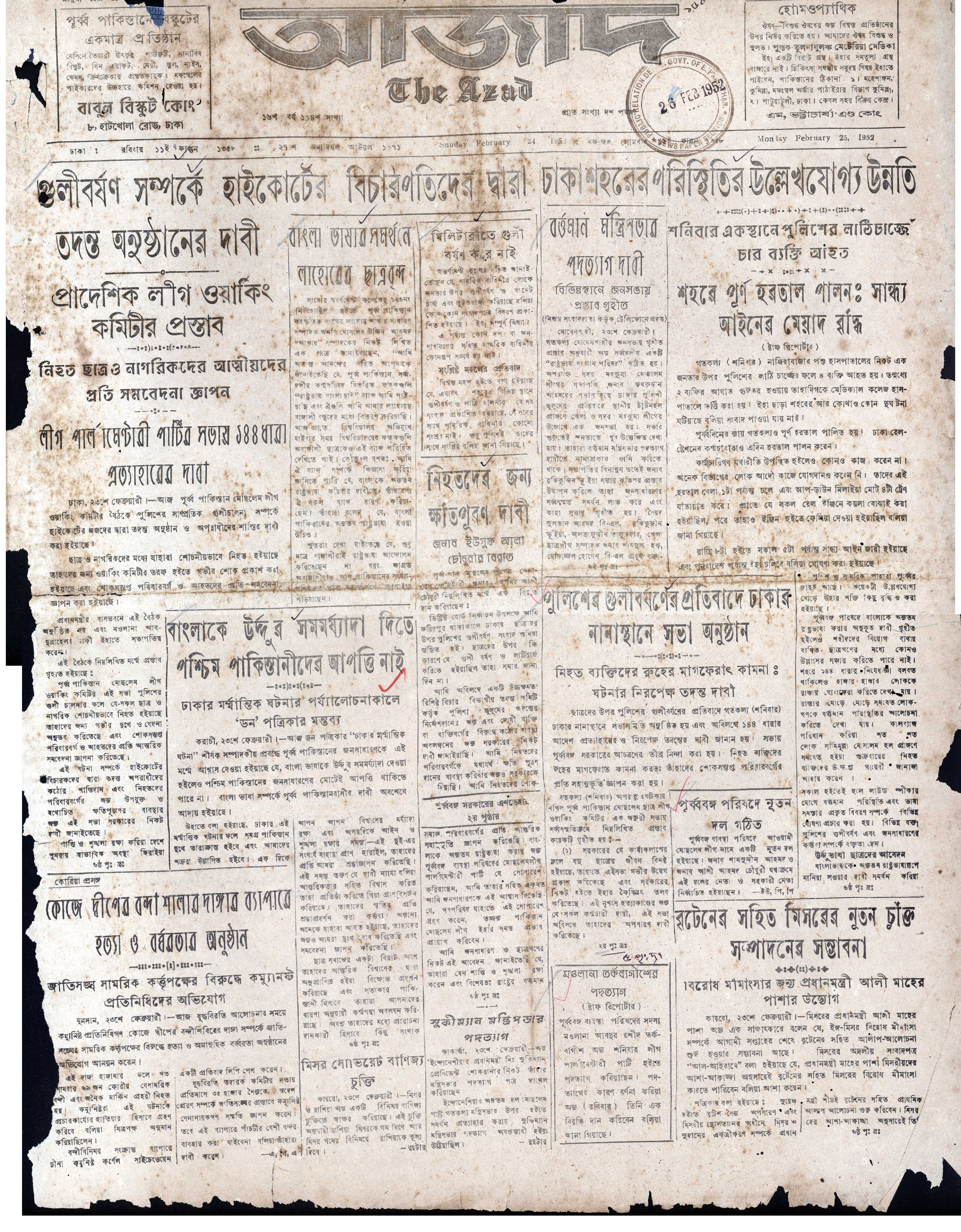 Mother Language Movement is the awakening period of Bengali nationalism. It was the first collective protest against Pakistani exploitation and deprivation. Through the pathway of this movement, Bengalis achieved the dreamland of a thousand years – Bangladesh. Without any doubt The Language Movement is a unique event in the political history of Bangladesh. It was reflected everywhere. In history, politics, art, culture, literature - we can find the language movement. Newspapers are not the exception. When we talk about newspapers in 1952, The Azad comes to the forefront of discussion.