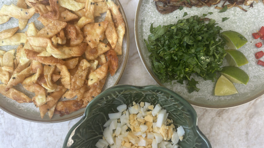 The comforting smell of a delicious bowl of coconut broth and toasted spices wafting from the kitchen takes me back to my childhood. I am reminded of sitting at the table with my parents, excited about assembling this delicious bowl of chicken and noodles in coconut broth, customised to my needs, with namakpara, boiled egg, shutki powder, chopped coriander, and an abundance of chopped green chilli. The dish is Khow Suey. However, how did this dish—so central to our family get-togethers, yet so different from everything else we eat in Bengali cuisine, with its preponderance of rice in Bangladesh—come to be here? Where did it come from?