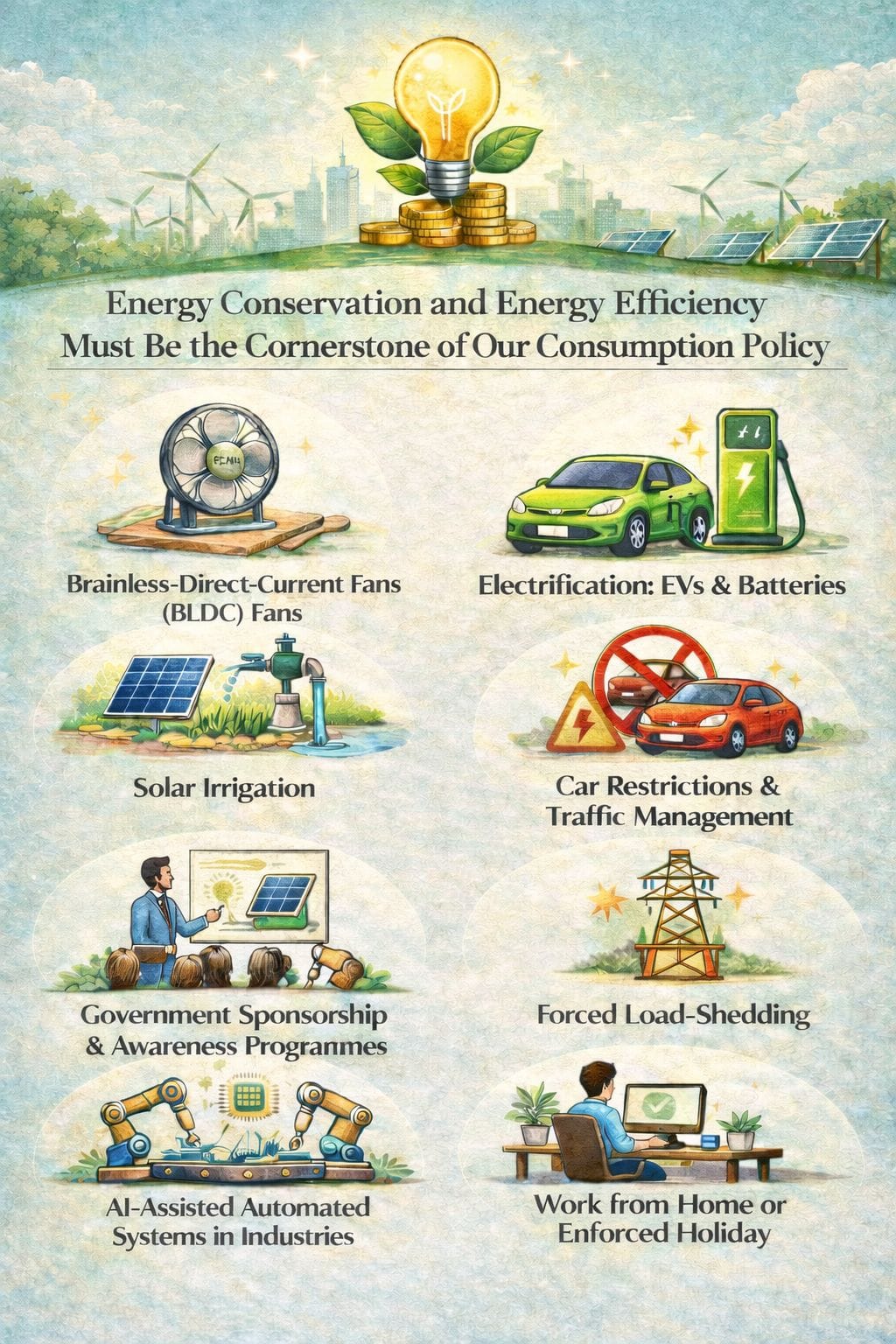 Energy conservation and efficiency must be the cornerstone of our consumption policy. It’s imperative to note the difference between the two. Conservation is what you do for yourself, and energy efficiency needs some investment, such as buying different fans, so energy efficiency always requires some sort of government sponsorship.