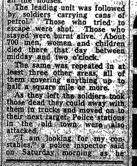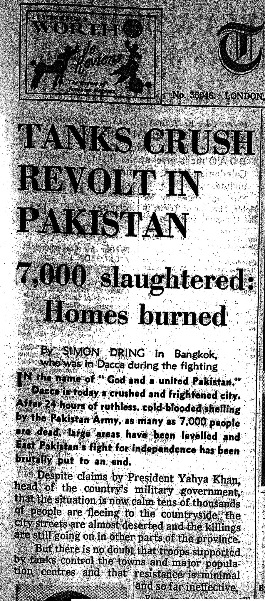 “In the name of ‘God and a united Pakistan’, Dacca [Dhaka] is today a crushed and frightened city. After 24 hours of ruthless, cold-blooded shelling by the Pakistan Army, as many as 7,000 people are dead, large areas have been levelled, and East Pakistan’s fight for independence has been brutally put to an end.
