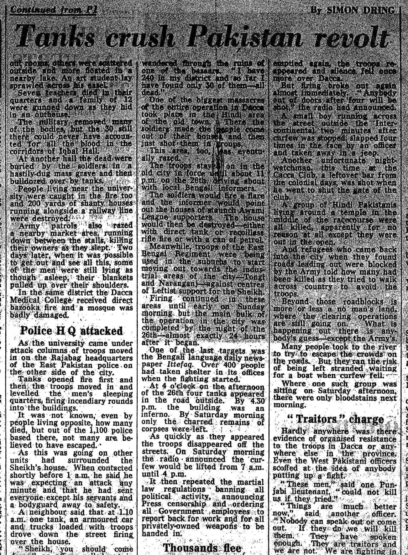 It was not known, even by people living opposite, how many died, but out of the 1100 police based there, not many are believed to have escaped.’ – in this part of ‘Tanks Crush Revolt in Pakistan’, Simon described the Bangali resistance at the East Pakistan Police headquarters. Simon also added in this remarkable news story about the burning down of two pro-liberation newspapers. The People was attacked in the first hour of Operation Searchlight, and Daily Ittefaq on the afternoon of 26 March. Simon described the attack on The People as follows: ‘There was still heavy shelling in some areas but the fighting was noticeably beginning to slacken. Opposite the Intercontinental Hotel, a platoon of troops stormed the office of Dacca’s The People newspaper, burning it down along with most houses in the area and killing a lone night-watchman.’
