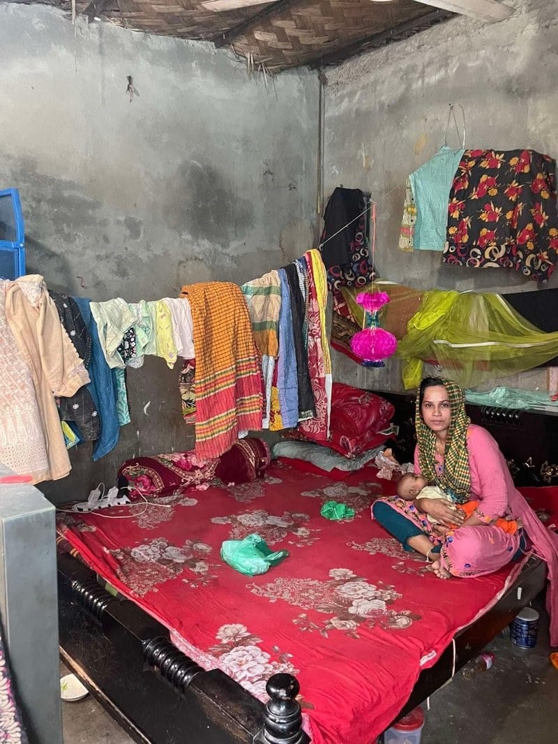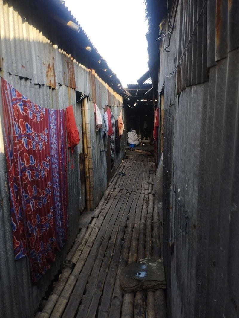The first thing you notice, on entering the lanes of Shyampur, is how little sky there is. Tin walls press close on both sides, laundry is strung overhead, and the air is filled with the dark fog of industrial smoke from the adjacent factories. When asked whether the smoke bothers them, residents simply shrug, calling it “Dhaka’r aboha” (Dhaka’s weather).