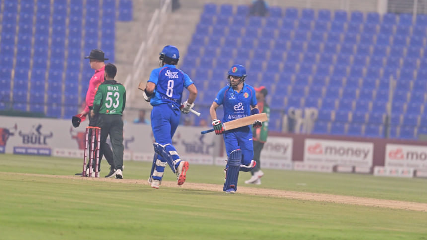 Miraz made a patient 60 off 87 balls with just a four and a six, while Hridoy's 56 off 85 deliveries included three sixes and a four, yet both struggled to accelerate against disciplined Afghan bowling.