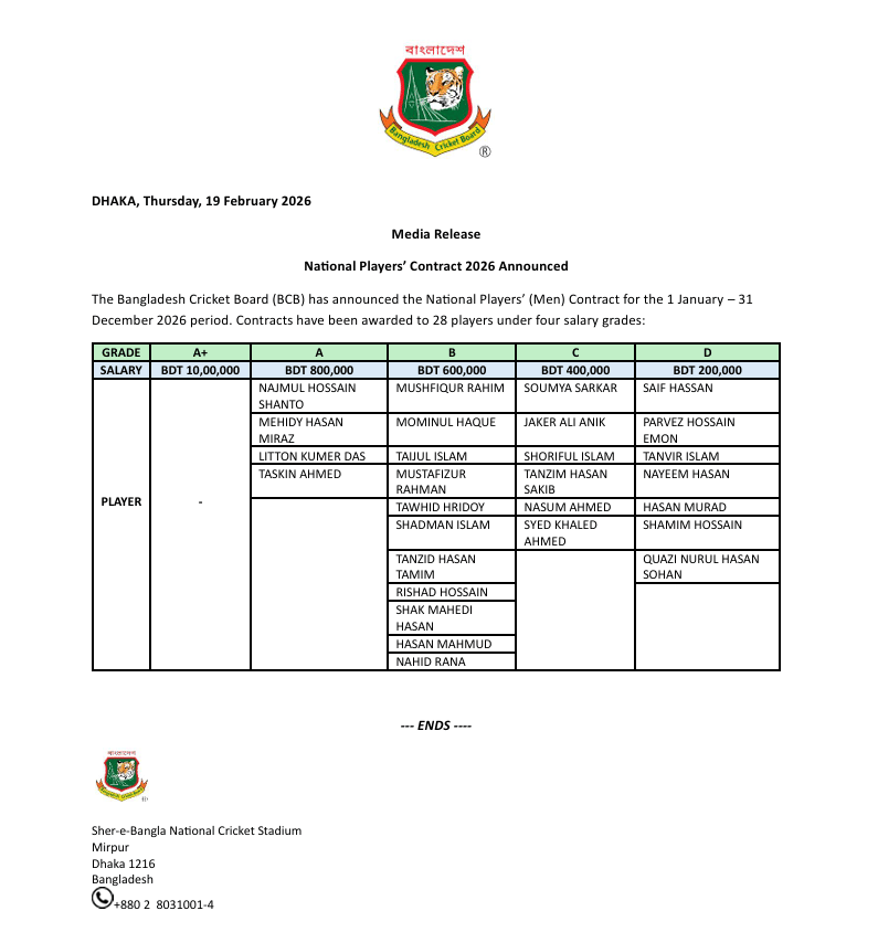 Bangladesh Cricket Board (BCB) named 28 cricketers in its national players’ (Men) contract for 2026, but left the highest-paying A+ category vacant, with no player earning a place at the top tier.