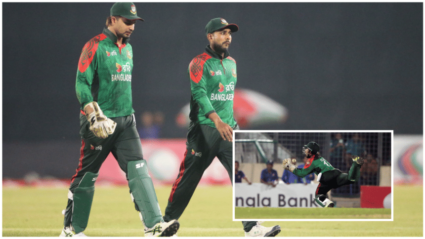 Despite being aided by two wides, a no-ball, and a leg bye in the Super Over, Bangladesh failed to make use of the opportunities. Soumya Sarkar scored three off three balls, while Saif Hassan managed two off three. Najmul Hossain Shanto failed to make contact with his bat but ran a leg bye before Saif could not find the boundary, with the Tigers needing three to win off the final delivery.