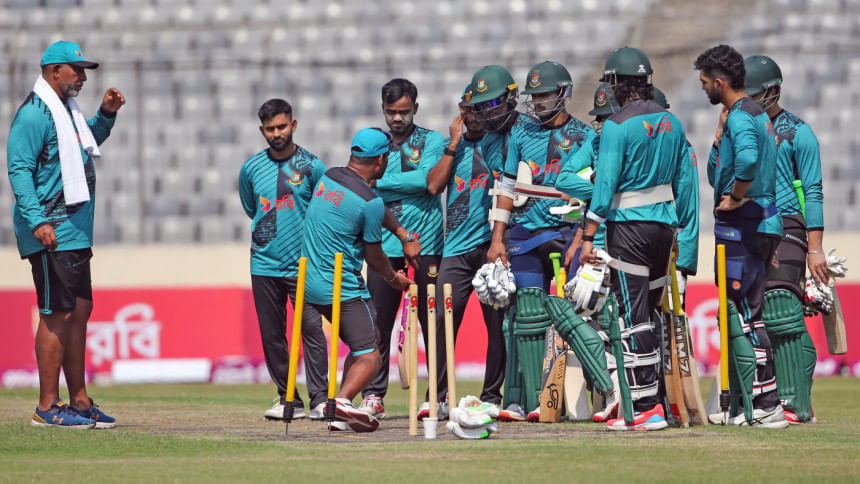 Former skipper Najmul Hossain Shanto, who made a dogged 32 in the last match, batted at the centre nets with two stumps right behind his legs -- on the left of where a left-hander's leg stump would be -- to work on his backfoot movement, which was causing him to fall over while playing through the leg-side.
