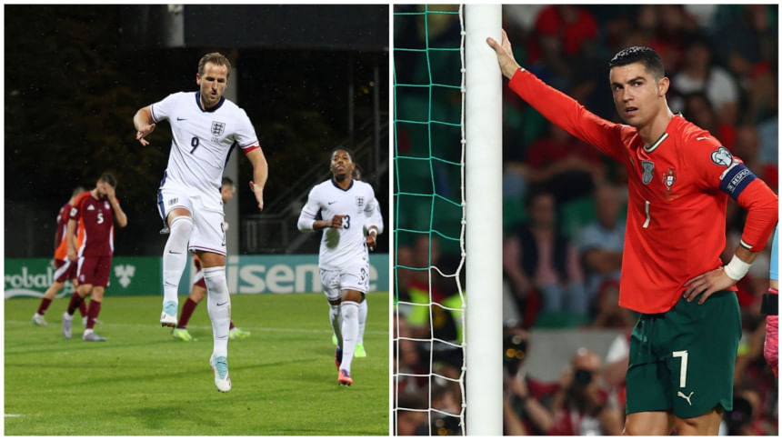 Harry Kane scored twice as England thrashed Latvia 5-0 on Tuesday to secure qualification for the 2026 World Cup, while Cristiano Ronaldo's Portugal were forced to wait to clinch their spot at the finals after being held by Hungary.
