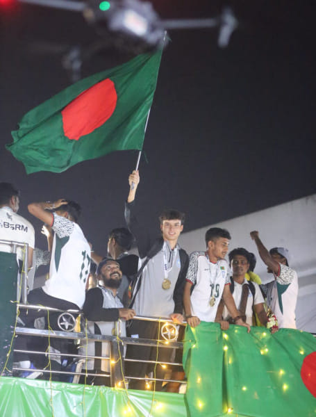 SAFF U-20 champions Bangladesh returned home yesterday amid a festive mood, with a trophy parade from Hazrat Shahjalal International Airport to the Hatirjheel Amphitheatre on an open-top bus -- a grand reception reminiscent of those previously hosted by the Bangladesh Football Federation for the history-making women’s national and futsal teams.