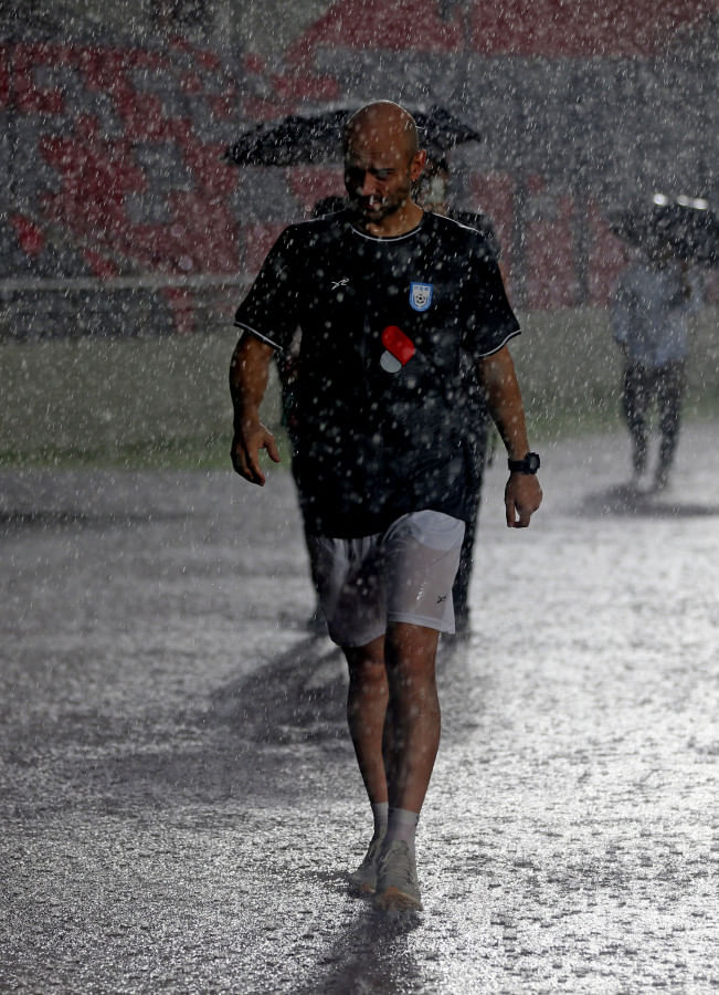 The men in red and green pushed through their warm-ups and stretches before the storm forced players, coaches and staff to scatter for cover, their drills cut short by sheets of rain.