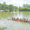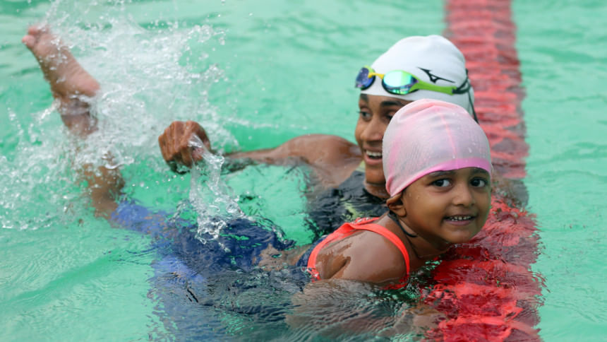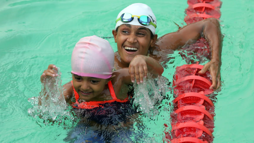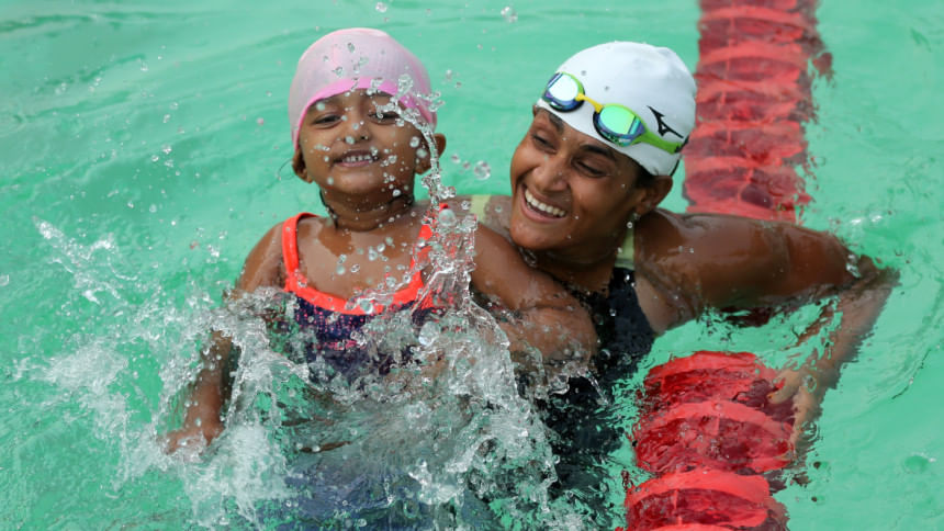 Bangladesh Army's Romana Akter did not let go of the chance to celebrate her fifth gold medal with her four-and-a-half-year-old daughter after finishing first in the 100m butterfly event on the third day of the 34th National Swimming Championships at the National Swimming Complex in Mirpur on Wednesday. Romana's daughter, Falak Ahmed Ruzba, enjoyed splashing around in the pool, making her mother's achievement even brighter. Photo: Firoz Ahmed