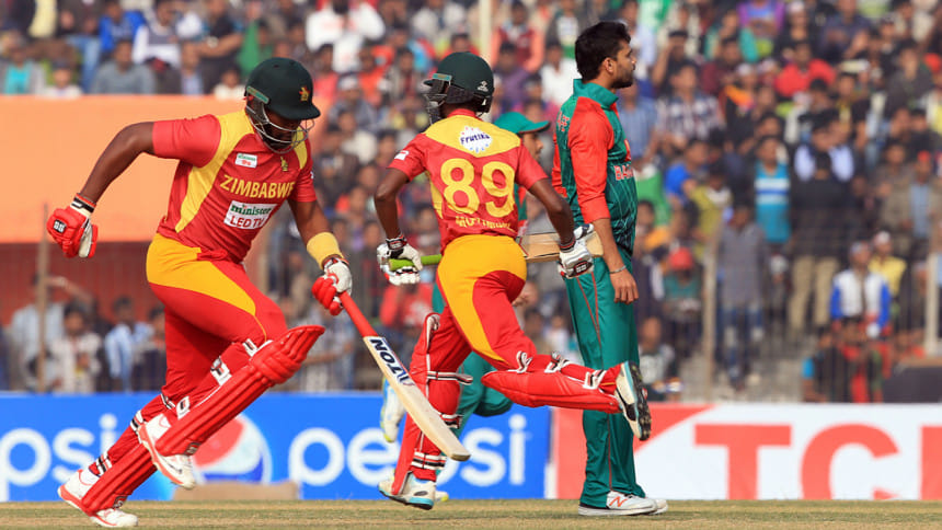 In the fifth over of Zimbabwe's innings, Hamilton Masakadza ripped his wrists to lift Taskin Ahmed over midwicket. He did not follow the path of the lofted shot, but suddenly he looked up and saw the ball going too high without a fielder under it. Thinking it could fall inside the rope, he started to run while his partner Richmond Mutumbami kept strolling. However, the ball had by then ended up in the stands at midwicket.