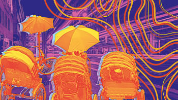 Velutha keeps his eyes on the road, not to take a wrong turn while crossing the endless street. As the streetlights pass, their reflection illuminates his face every other second.