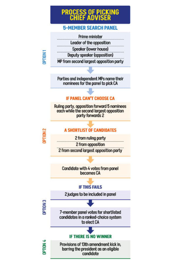 The main opposition will select one from the ruling party's list, and vice versa. They will also pick one nominee from the second-largest party's list. At this point, four out of five panel votes will suffice to select a chief adviser from the short list.