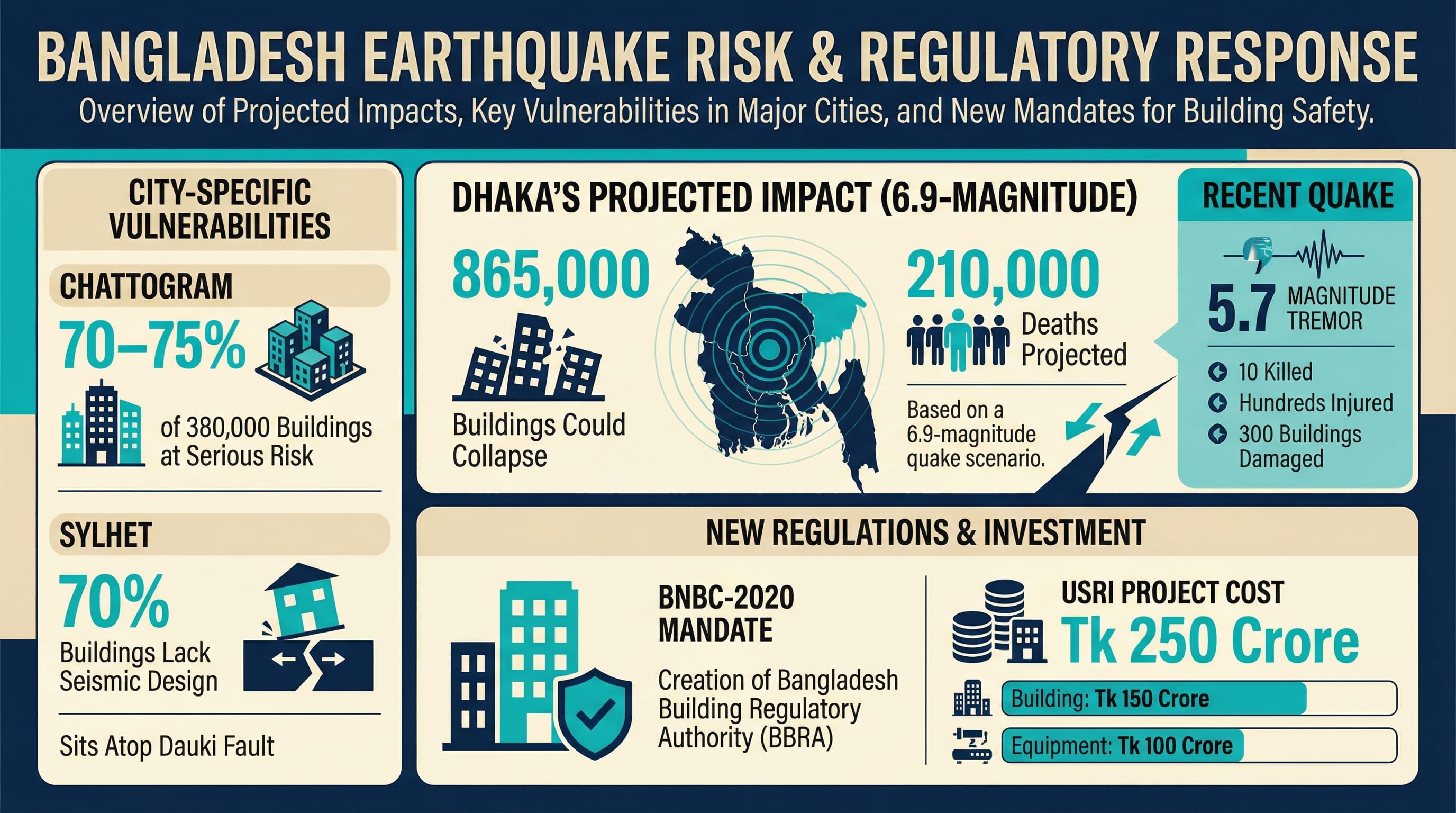 In Chattogram, assessments show that 70–75 percent of more than 380,000 buildings are at serious risk, while Sylhet, sitting atop the active Dauki Fault, faces rising micro-quakes with over 70 percent of buildings lacking seismic design.
