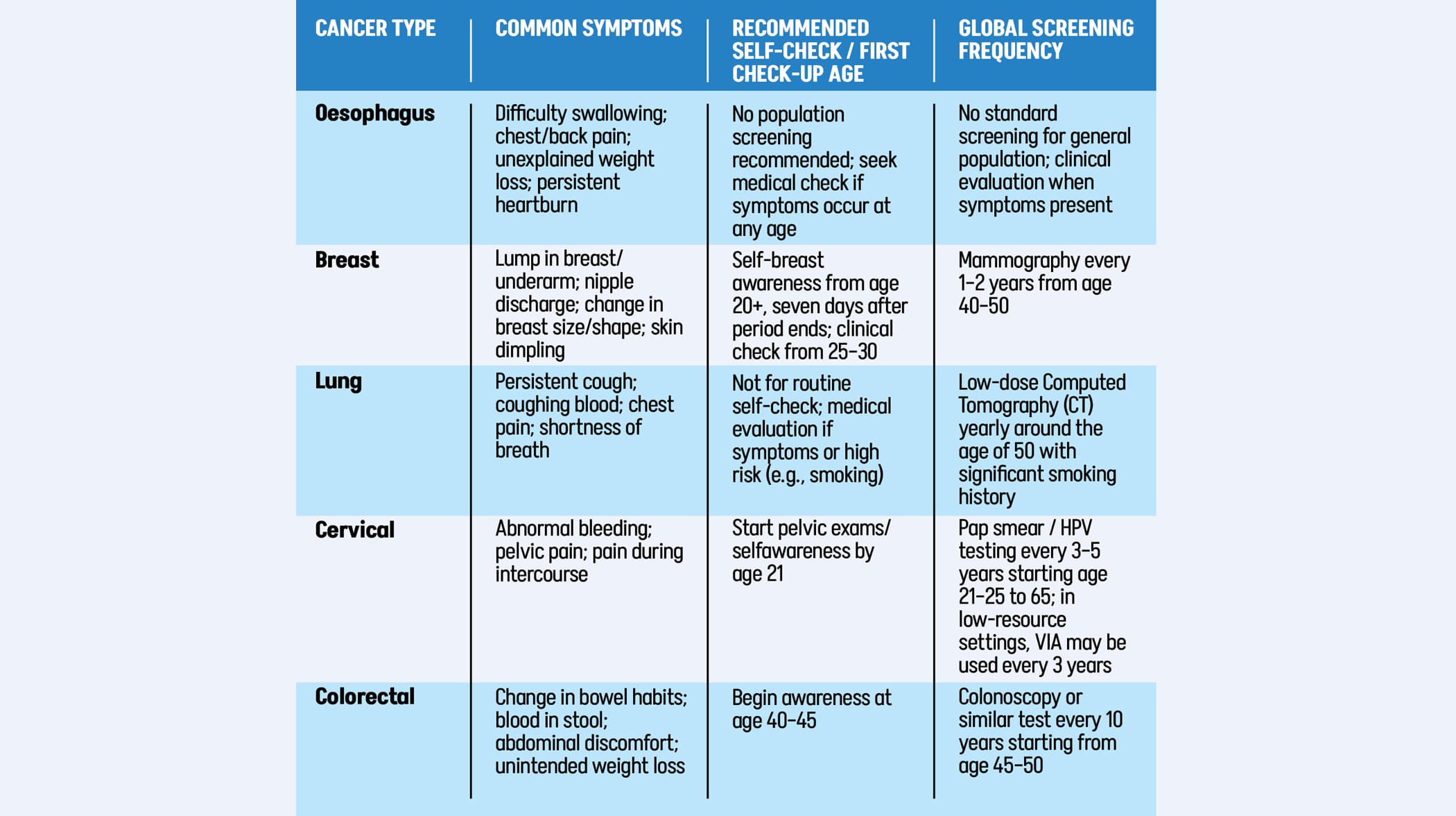 Globally, early detection through routine screening dramatically improves survival rates. According to World Health o For example, breast cancer detected before the spread has significantly higher 5-year survival than cancers found at later stages, and programmes like mammography and cervical screening (Pap/VIA) have been shown to reduce deaths by enabling earlier treatment. Standard guidelines recommend regular screening starting at specific ages tailored to cancer type, even for asymptomatic individuals, as most early cancers do not cause noticeable symptoms. Following recommended screening schedules increases chances of cure, reduces treatment burden, and saves lives.