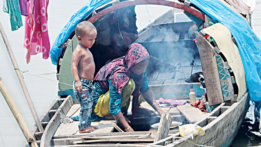 In Char Monai union, just six to seven kilometres from Barishal city, two Manta fleets live along the Kalabadar River, while another floats on the Arial Khan. According to the Department of Social Services and local NGOs, more than 350 people live in these three clusters.