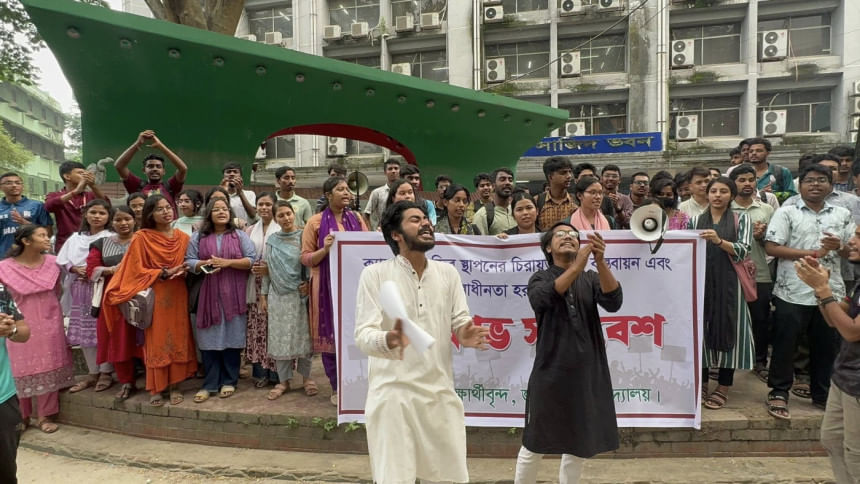 The procession began around noon from the university's Shaheed Minar and moved through different campus roads before ending at Shanto Chattar with a brief rally.